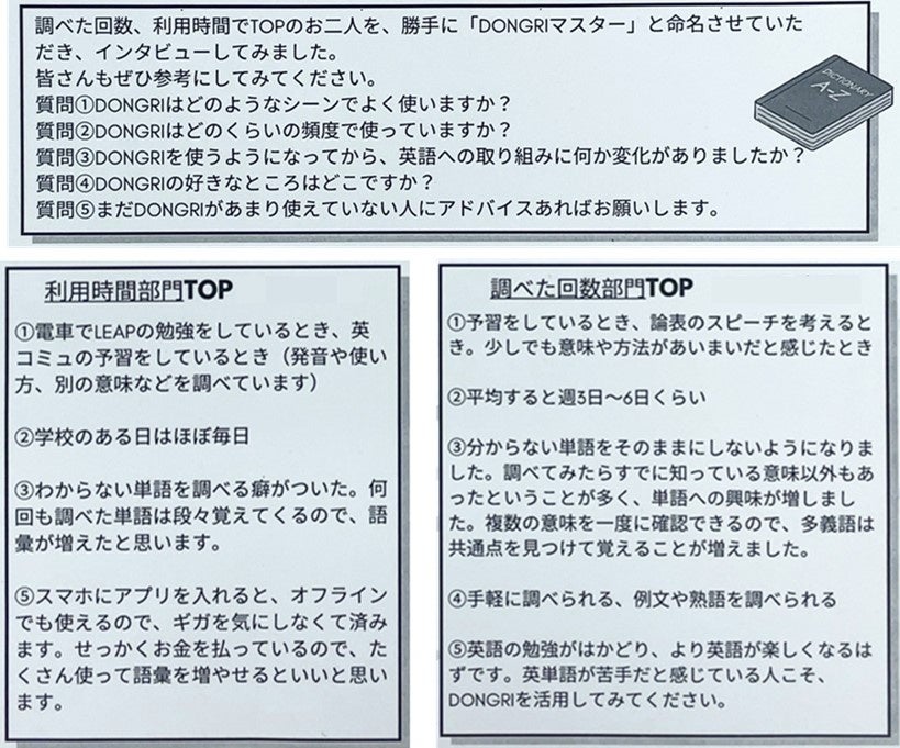 この取り組みを参考に、須田先生は「DONGRIマスター」を企画した。DONGRIの「ダッシュボード機能」にある「学習概要」を使えば、生徒各自の辞書の利用状況をExcelに書き出すことができる。今回須田先生は、DONGRIの利用時間と調べた回数がトップの生徒にインタビューを行い、それを英語通信に掲載することで、辞書活用のヒントを学年全体に共有しようと考えた。