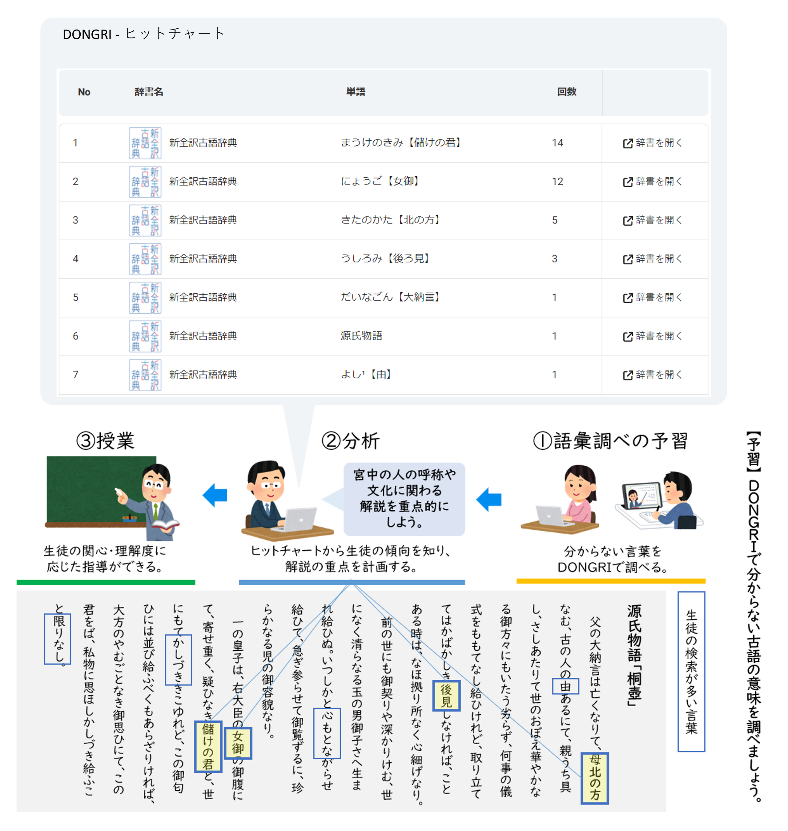 新たにDONGRIの一括導入校向けにリリースした「ダッシュボード機能」を利用すると、教師は生徒による辞書の利用状況を確認することができます。浦和第一女子高等学校の活用事例では、ダッシュボード機能から得られるスタディログを日々の指導に役立てる具体的な取り組みを紹介しています。