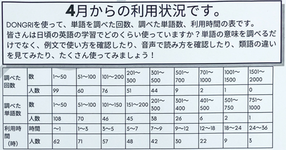 上記と同じように、須田先生は「ダッシュボード機能」を使ってDONGRIの活用状況の分布を書き出し、次のように英語通信で生徒に共有した。
