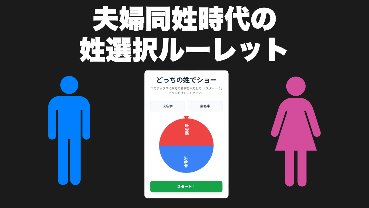 東京都認証特定非営利活動法人 結婚相談NPO(所在地:東京都武蔵野市)は、結婚に際して「妻側の姓を名乗ることも可能である」ということを認識していただく為に、ルーレット形式で姓を選択できるウェブアプリ「どっちの姓でショー」を開発、公開しました。