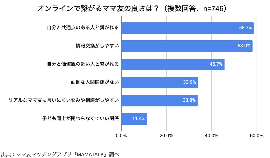 オンラインで繋がるママ友の良さについては、「自分と共通点のある人と繋がれる」(58.7%)、「情報交換がしやすい」(58.0%)、「自分と価値観の近い人と繋がれる」(45.7%)などが多く挙げられました。テクノロジーの力で情報を共有することでママ友作りが効率化されていることが分かりました。「面倒な人間関係がない」(33.9%)、「リアルなママ友に言いにくい悩みや相談がしやすい」(33.8%)など、リアルな人間関係では解消できない点をオンラインの繋がりが補完していることが見受けられました。