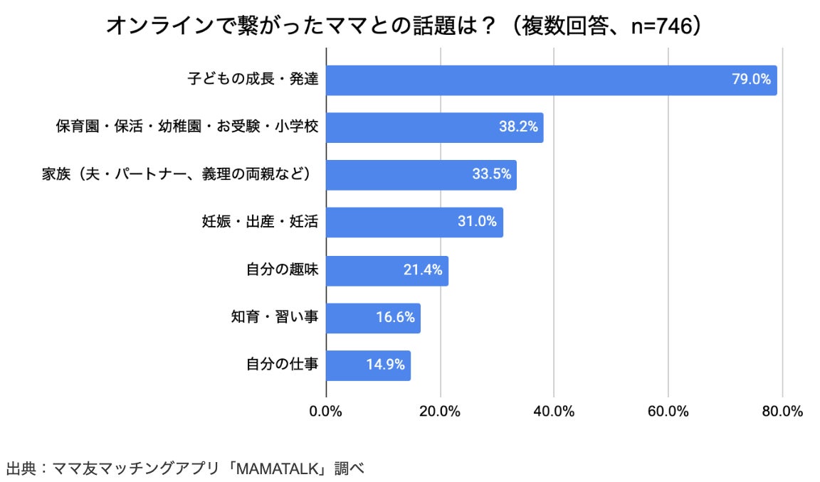 「オンラインで繋がったママと、どんな話題で交流しましたか?」との問いに対して、「子どもの成長・発達」(79.0%)、「保育園・保活・幼稚園・お受験・小学校」(38.2%)、「家族(夫・パートナー、義理の両親など)」(33.5%)、「妊娠・出産・妊活」(31.0%)、「自分の趣味」(21.4%)などが多く挙げられました。子育てに関してのみならず、「家族」や「自分の趣味」などママ自身のプライベートな話題でもオンラインでママ同士が交流していることが分かりました。