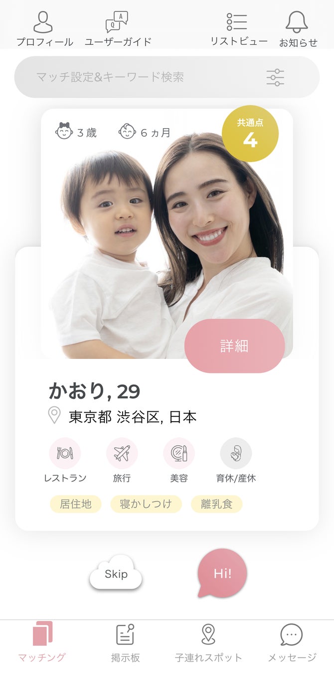 MAMATALKでは、居住エリアに加え、子どもの年齢、ママの働き方や趣味/興味など、「共通点」のあるママ友とアプリを通じて出会うことができます。保育園、習い事、病院、お出かけスポットなど。子育て中のママ同士だからこそ、役立つ情報交換があり、解決し合える悩みがあります。