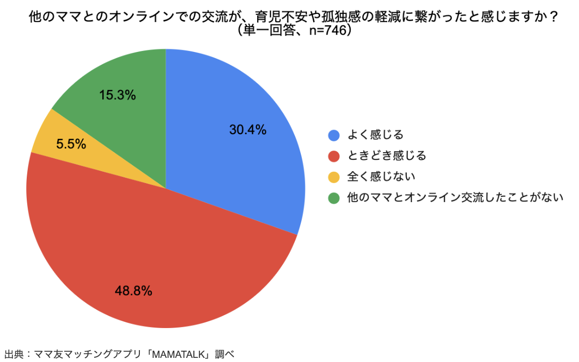 「他のママとのオンラインでの交流が、育児不安や孤独感の軽減に繋がったと感じますか?」に対しては、「よく感じる」(30.4%)、「ときどき感じる」(48.8%)と、オンラインでのママ同士の交流によって育児不安が軽減されたと感じたことがあるママが79%いました。