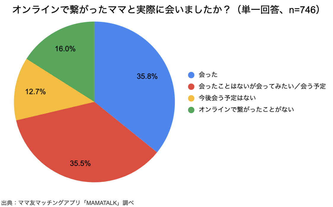 「オンラインで繋がったママと実際に会いましたか?」との質問に対しては、35.8%が「会った」、35.5%が「会ったことはないが会ってみたい」と回答し、71%がオンラインからリアルの繋がりに発展することを望んでいることが分かりました。