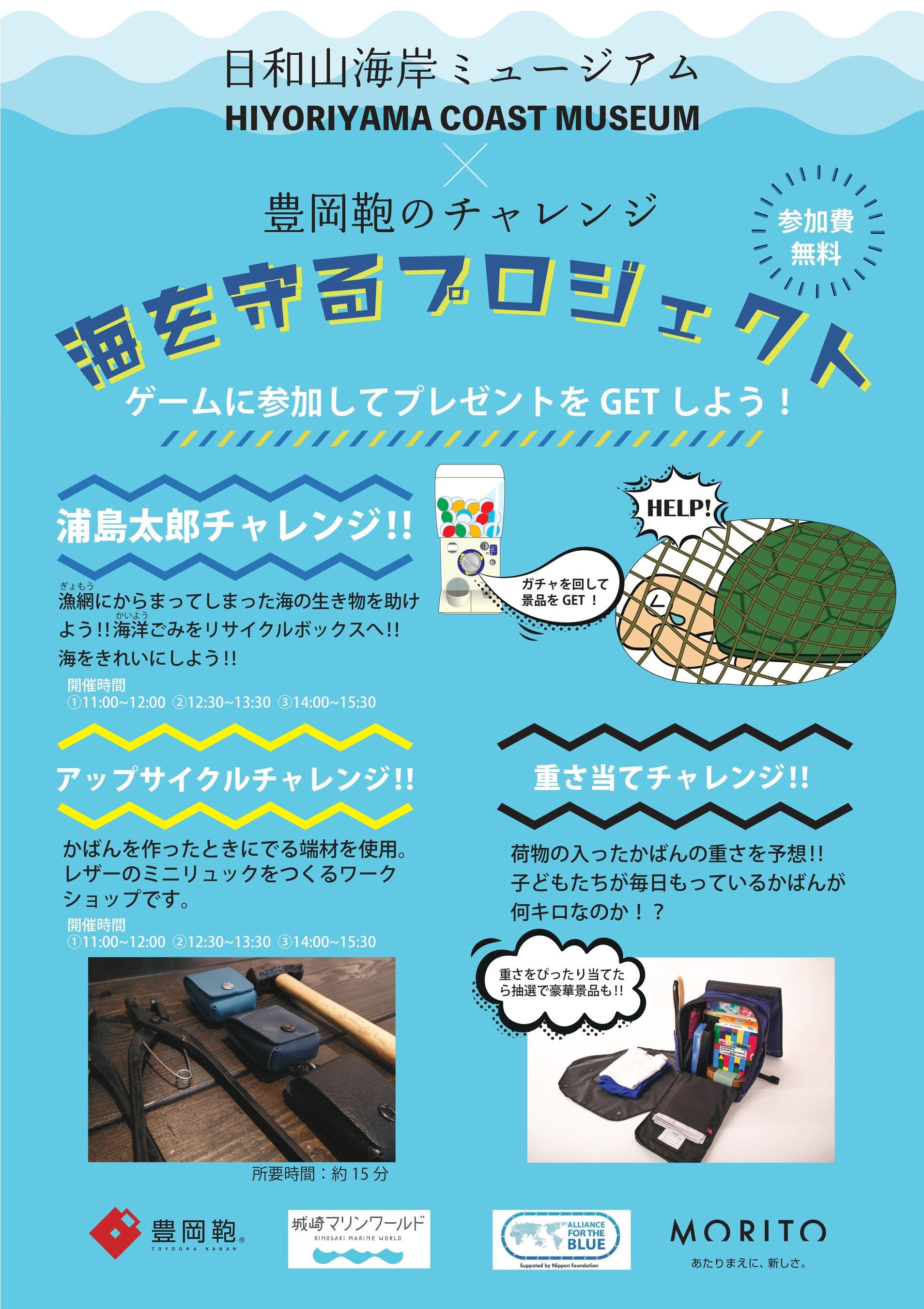 イベント会場となる城崎マリンワールドも海と一体化した水族館であり、美しい「海」を活かした施設。兵庫県鞄工業組合の取組みは、園内の施設「日和山海岸ミュージアム」で紹介している地域のチャレンジコーナーのひとつとして、7月15日(金)~7月20日(水)の期間、「豊岡鞄のチャレンジ」として活動を紹介します。