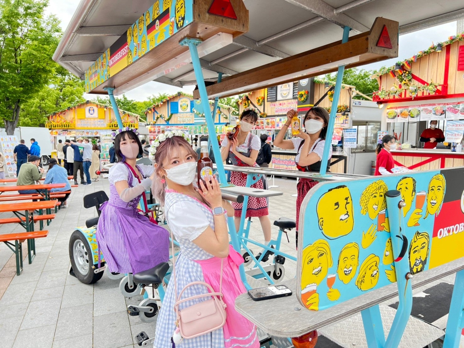 12人乗りの巨大なビアバイクがオクトーバー ガールと共に会場内を走ります! ビールを飲みながらお客様も自由に乗ること ができます♪ ぜひ、見かけた際は気軽に乗ってみてね♪
