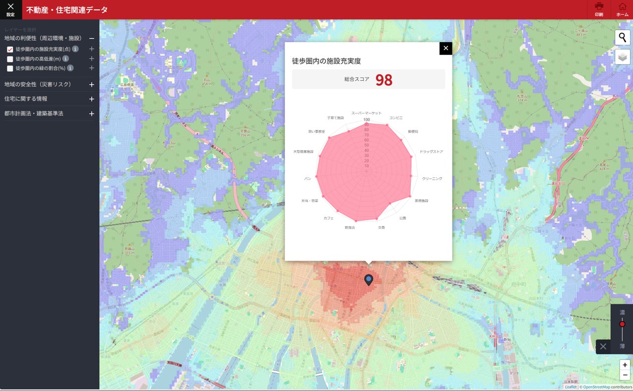 2024年12月より、広島県のインフラマネジメント基盤DoboXの公開ページに、徒歩圏内の施設充実度を評価した「Walkability Index」、徒歩圏内の高低差を評価した「高低差スコア」、徒歩圏内の緑の割合を評価した「みどりスコア」の掲載が始まっています。