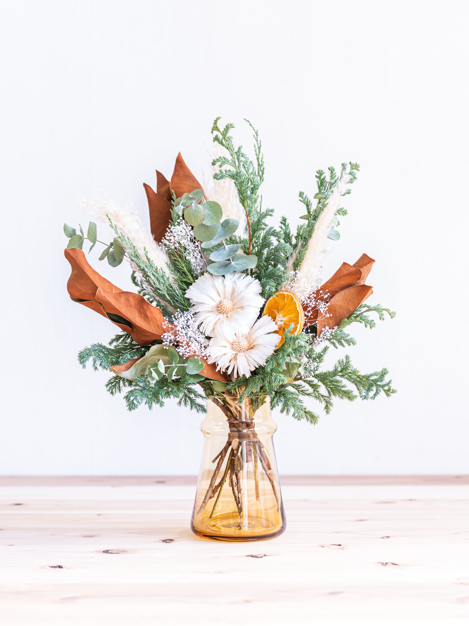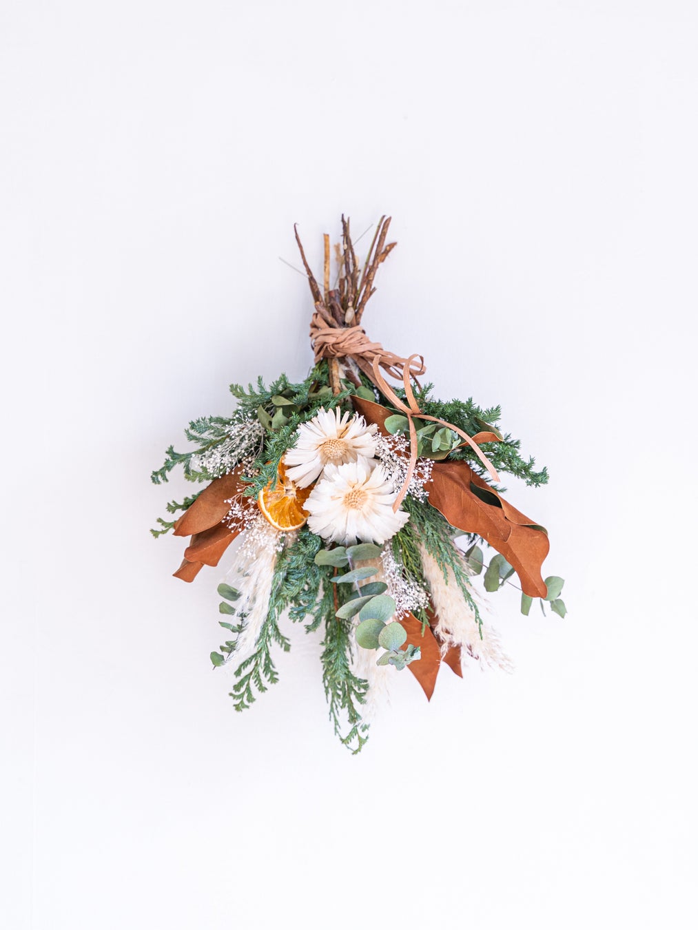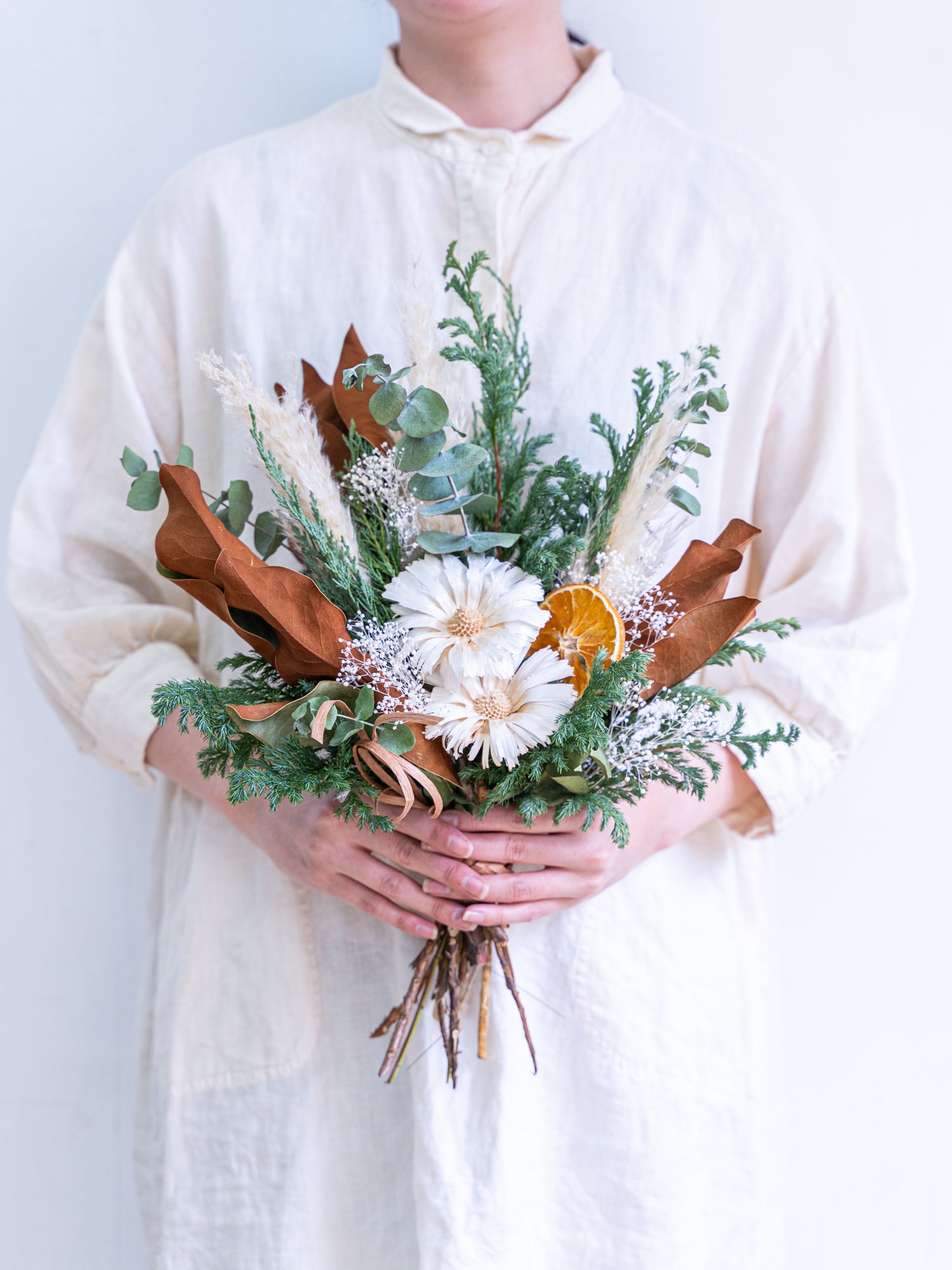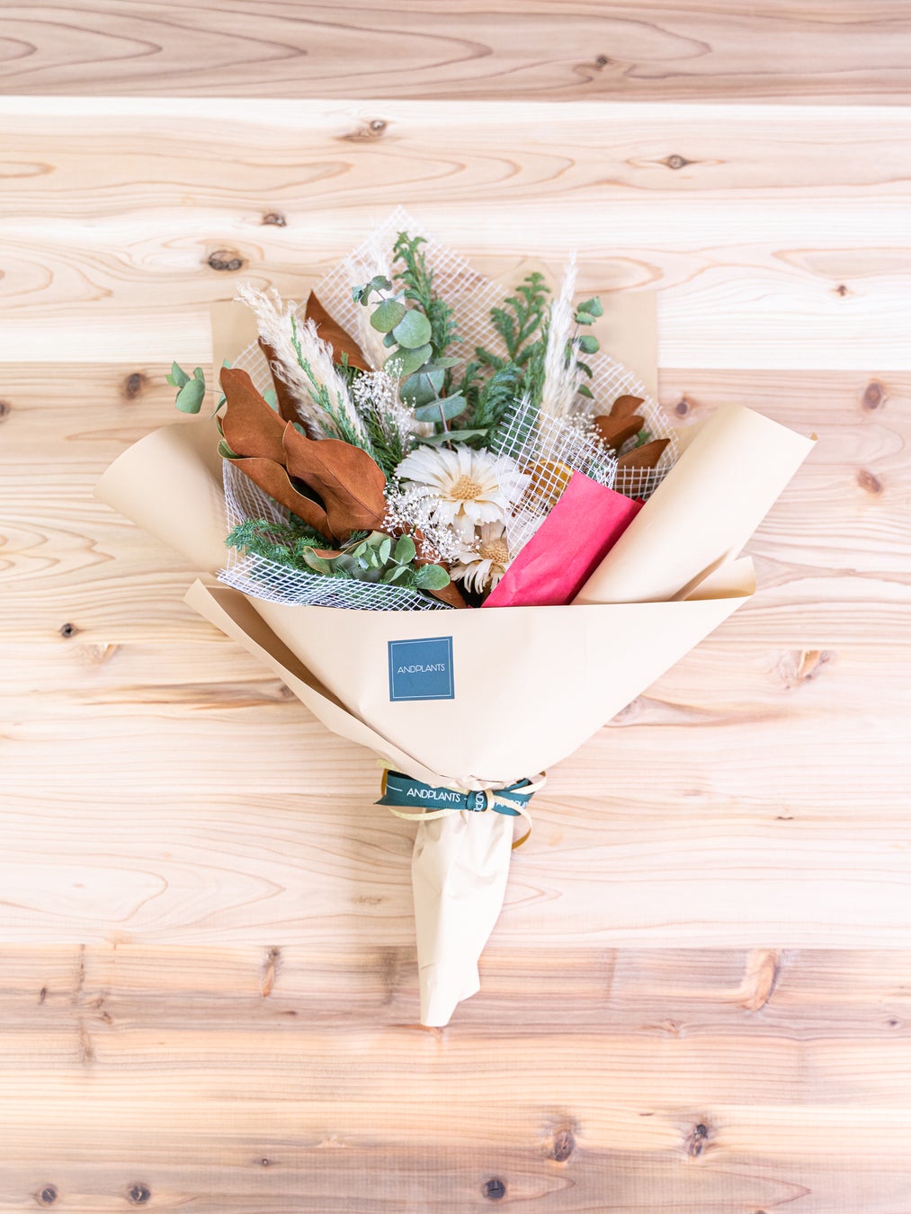 一般的なドライフラワーは発色を良くするために化学染料が使われることもありますが、 AND PLANTSでは化学染料を使わない花材で仕上げているため、植物の持つ自然のままの彩りをお楽しみいただけます。