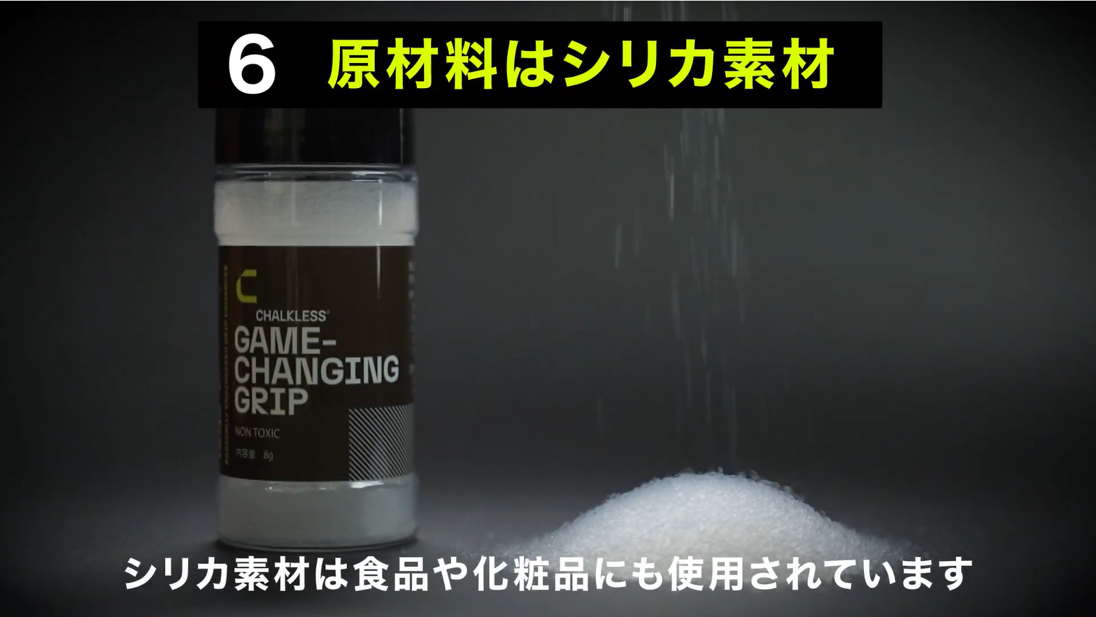 「チョークレス」は手汗滑りの根本原因である皮脂を取り除き、汗などの水分を弾く全く新しいタイプの滑り止めです。さらに原料はシリカ100%であり誰でも安全に安心して使うことが出来ます。