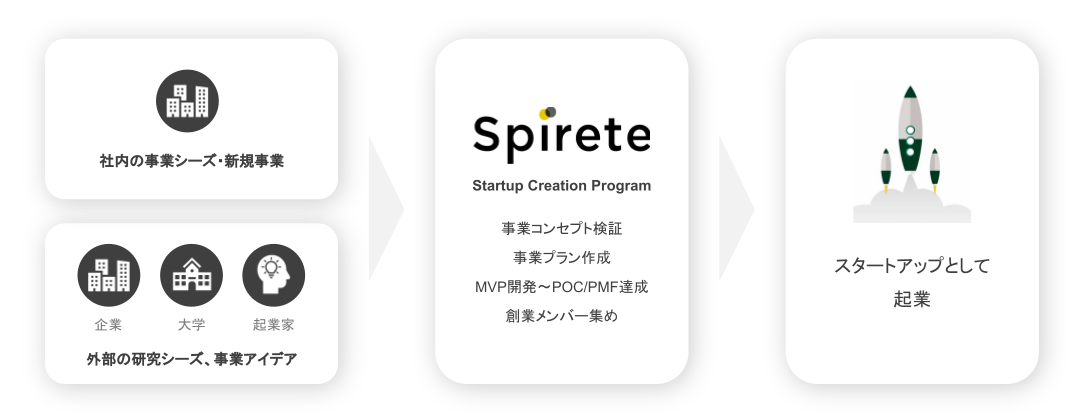 大企業に新規事業を行うための「スタートアップ特区」を創り、最終的にスタートアップとして起業することにより新事業の創出を狙うプログラムです。Spireteが、社内&社外に眠る事業シーズの発掘、経営者メンバー集め、事業計画検討、POC実施、スタートアップとしての起業、資金調達まで伴走します。