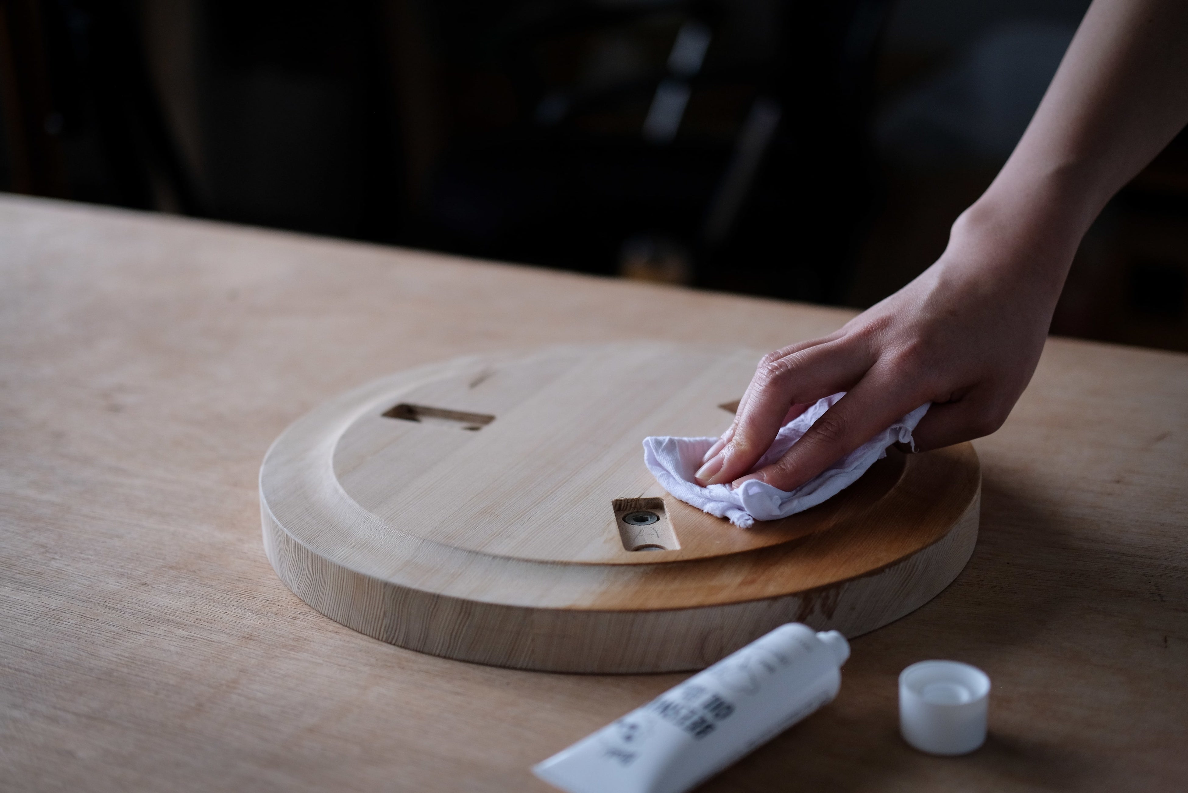 ミツバチが巣をつくるときに分泌するみつろうと、国内精製された食品グレードのコメ油をブレンドし、天然成分100%のオイルに仕上げました。コメ油は半乾性油のため、木工製品へしっかり浸透し乾燥被膜をつくる性質があります。非常に伸びが良く浸透性が高いクリーム状のオイルのため、塗布後はしっとりとした濡れ色に仕上がります。また、チューブ容器にすることで必要量を出しやすく、適度な粘性と伸び具合で作業効率が上がるため、ストレス無く塗布することができます。
