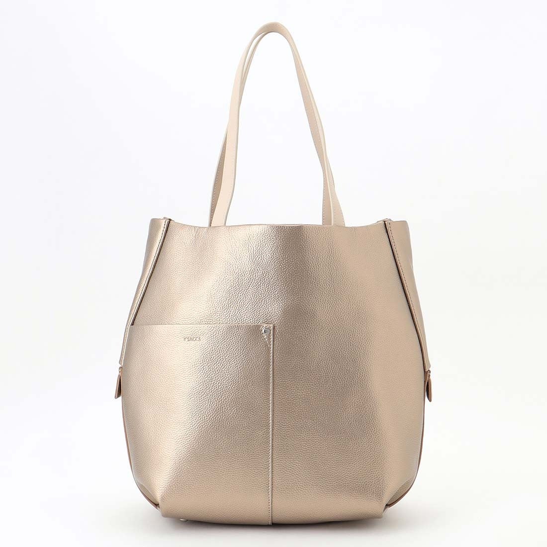 落ち着いた輝きのゴールドと丸みのある形で、女性らしい上質レザーのトートバッグ。