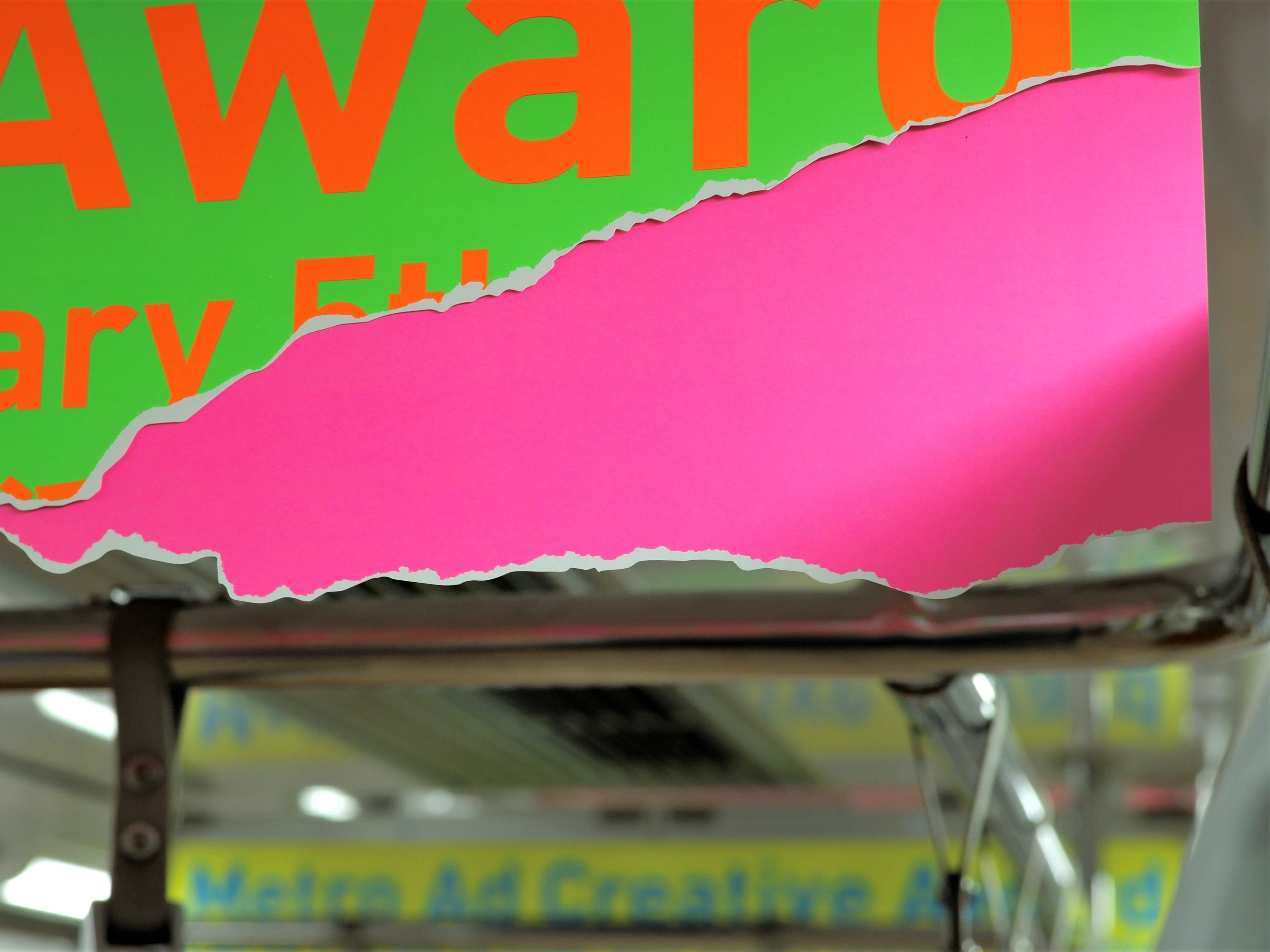 今回の意匠は2023年度のグラフィック部門審査員である、えぐちりか様にデザインしていただいたいたもので、鮮やかなカラーと破れたような形状が目を惹く大胆な特殊展開となっています。また、中づり広告ジャック車両の掲出期間終了後も、11月末ごろまで各路線にて中づり広告を掲出予定です。