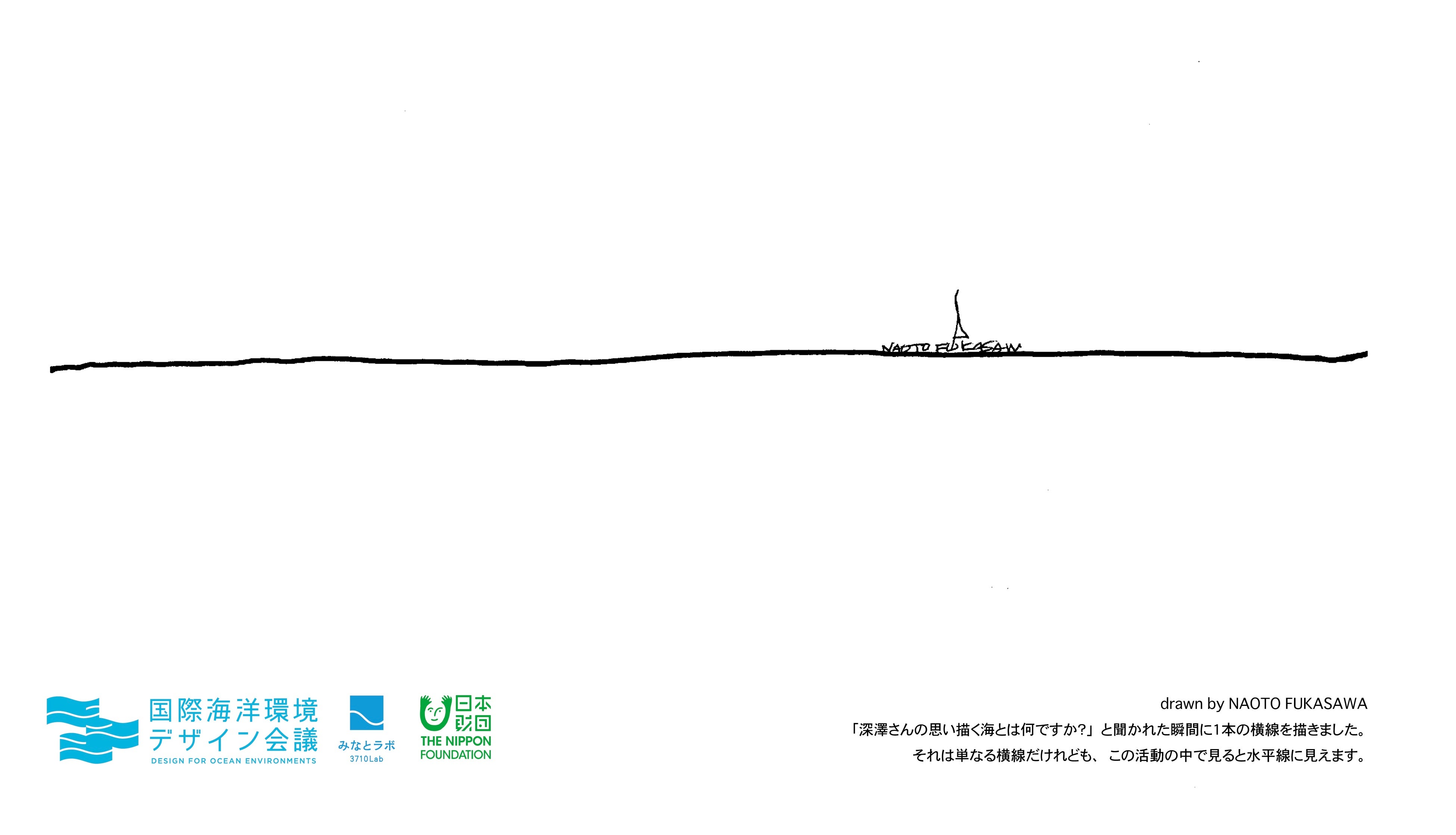 drawn by NAOTO FUKASAWA「深澤さんの思い描く海とは何ですか?と聞かれた瞬間に1本の横線を描きました。それは単なる横線だけれども、この活動の中で見ると水平線に見えます。」