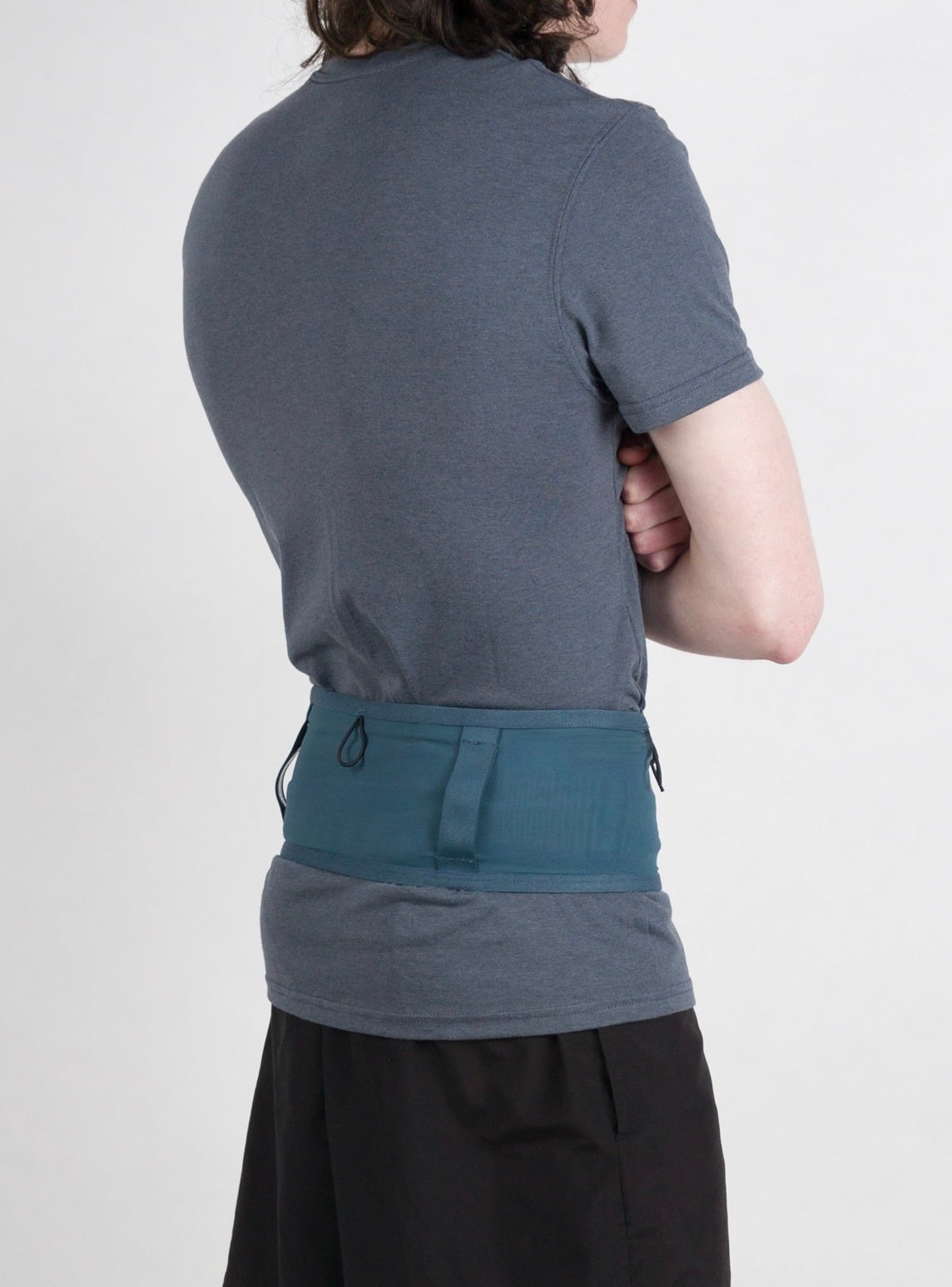 使用方法は簡単 - バンドに足を踏み入れ、上にスライドさせて腰の上にフィットさせます。内部は容量の同じ3つのポケットに分かれており、フラスク、エナジージェル、サングラス、ヘッドランプなど必要な装備を一度に持ち運ぶことが可能です。収納時はポケット上部のプルタブを引くことでグローブ装着した状態でも用意に開閉が可能。メインのポケット以外にも背面に2本装備されたシリコンループにより、トレッキングポールや丸めたレインシェルなども携行が可能です。