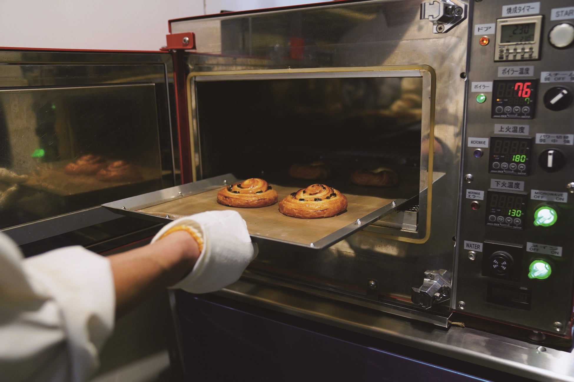 『マイウェイオーブン』は『新光食品機械販売株式会社』と共同開発し、2023年8月に国内特許を取得したマイクロ波・遠赤外線・スチームという従来の複合加熱に『圧力』を加えることでクラムに水分を追加浸透させる特許技術(冷凍パンの解凍装置、冷凍パンの解凍方法(特願2023-535753)を利用したものです。これまで再加熱によって損失せざるをえなかったクラム水分を補填し、焼き立て時のクラスト食感を失わない再焼成を実現。水分減少による老化を防ぎ、焼き立てと同じ状態を短時間で実現できます。-18℃~-20℃の冷凍状態のパンを約3分で復元でき、且つ老化も遅く、通常のベーカリーオーブンで焼成したものと変わらない状態で簡単に提供できます。