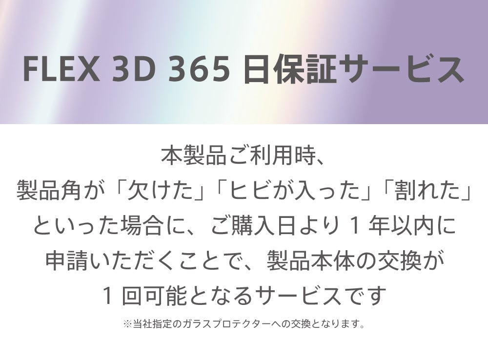 本製品ご利用時、製品角が「欠けた」「ヒビが入った」「割れた」といった場合に、ご購入日より1年以内に申請いただくことで、製品本体の交換が1回可能となるサービス、FLEX 3Dガラス、365日 安心保証サービスが付きます。