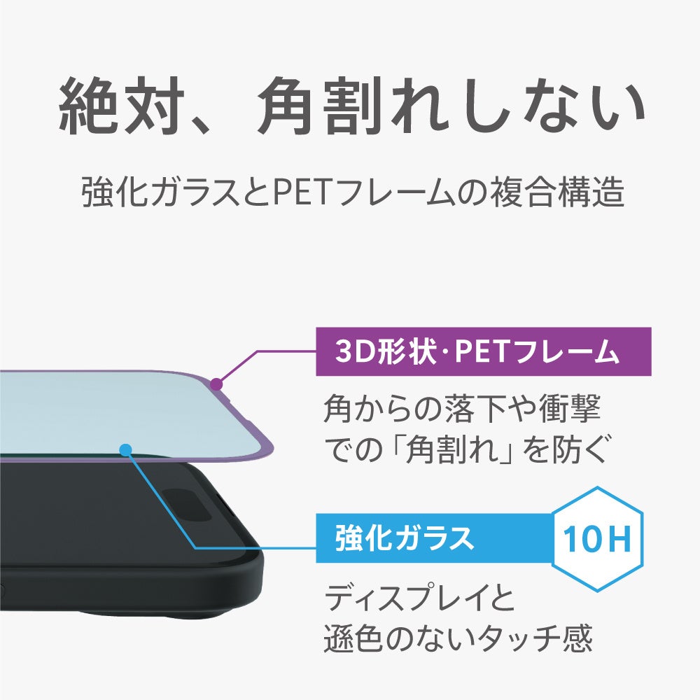 絶対、角割れしない。強化ガラスとPETフレームの複合構造