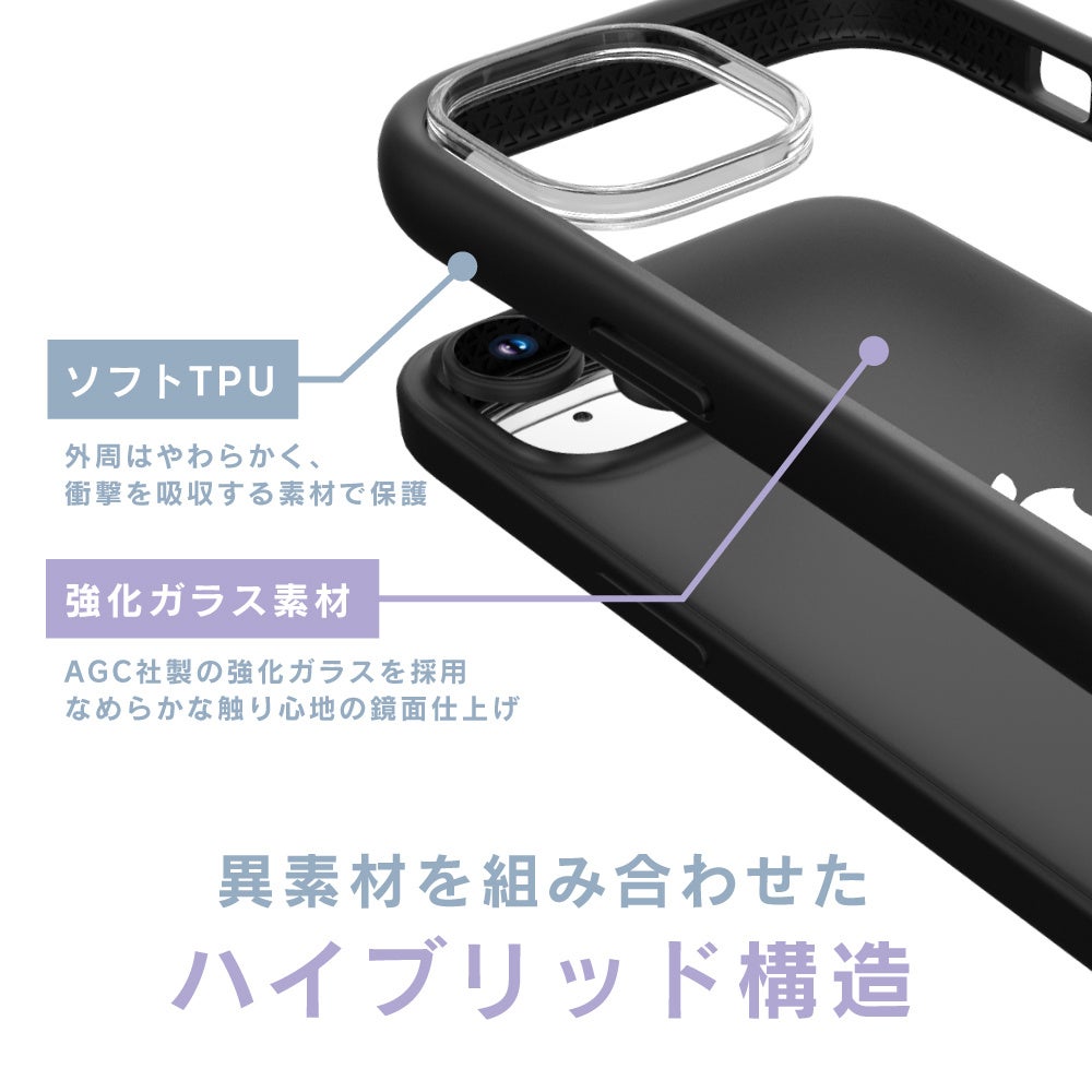 背面は高い硬度の強化ガラスで擦り傷から守り、側面は柔らかいTPU素材で衝撃から守る。可愛いのに強いハイブリッドケースです。