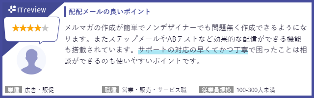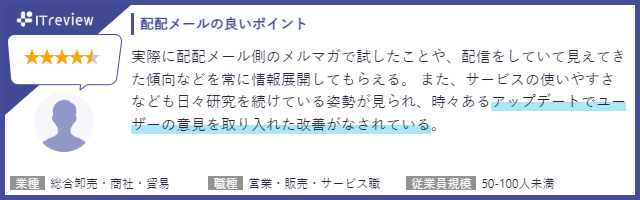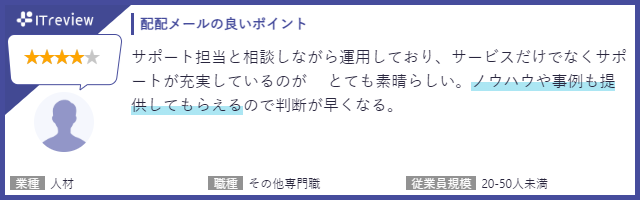 「ITreview」に掲載されている配配メールユーザー様のレビューを一部ご紹介いたします。「自社独自のノウハウ提供」や「ユーザー意見を取り入れたバージョンアップ」について、高評価をいただいております。