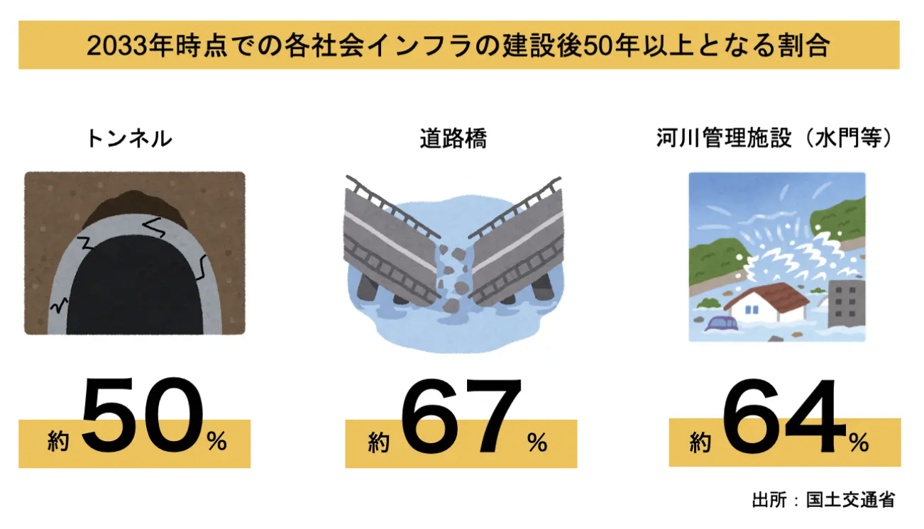 更には、日本国民の生活を支える社会インフラの老朽化が急速に進んでいます。