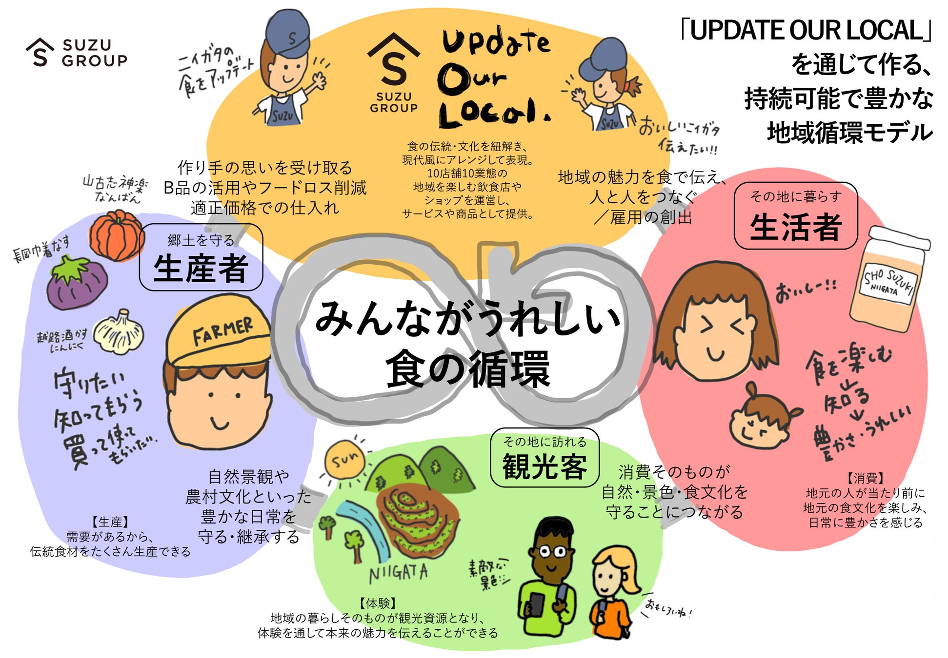 SUZU GROUP(以下「当社」)は、地域の食の魅力を通じて地域循環やまちづくりを創造するデザインカンパニーとして、飲食店事業や教育事業など、様々な事業を展開している会社です。