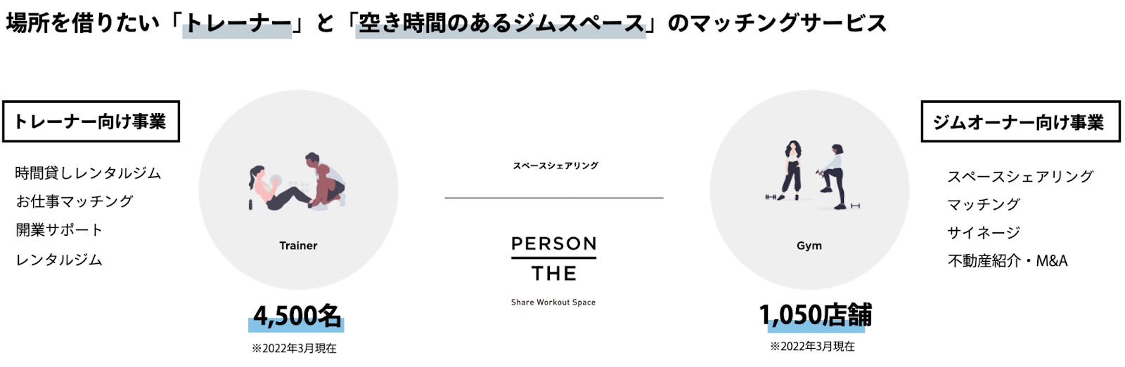 ジム利用者の課題解決を図るため、ジムの空室を貸し出したいオーナーとジムを利用したいトレーナーをマッチする、レンタルジムのシェアリングサービスを提供しています。