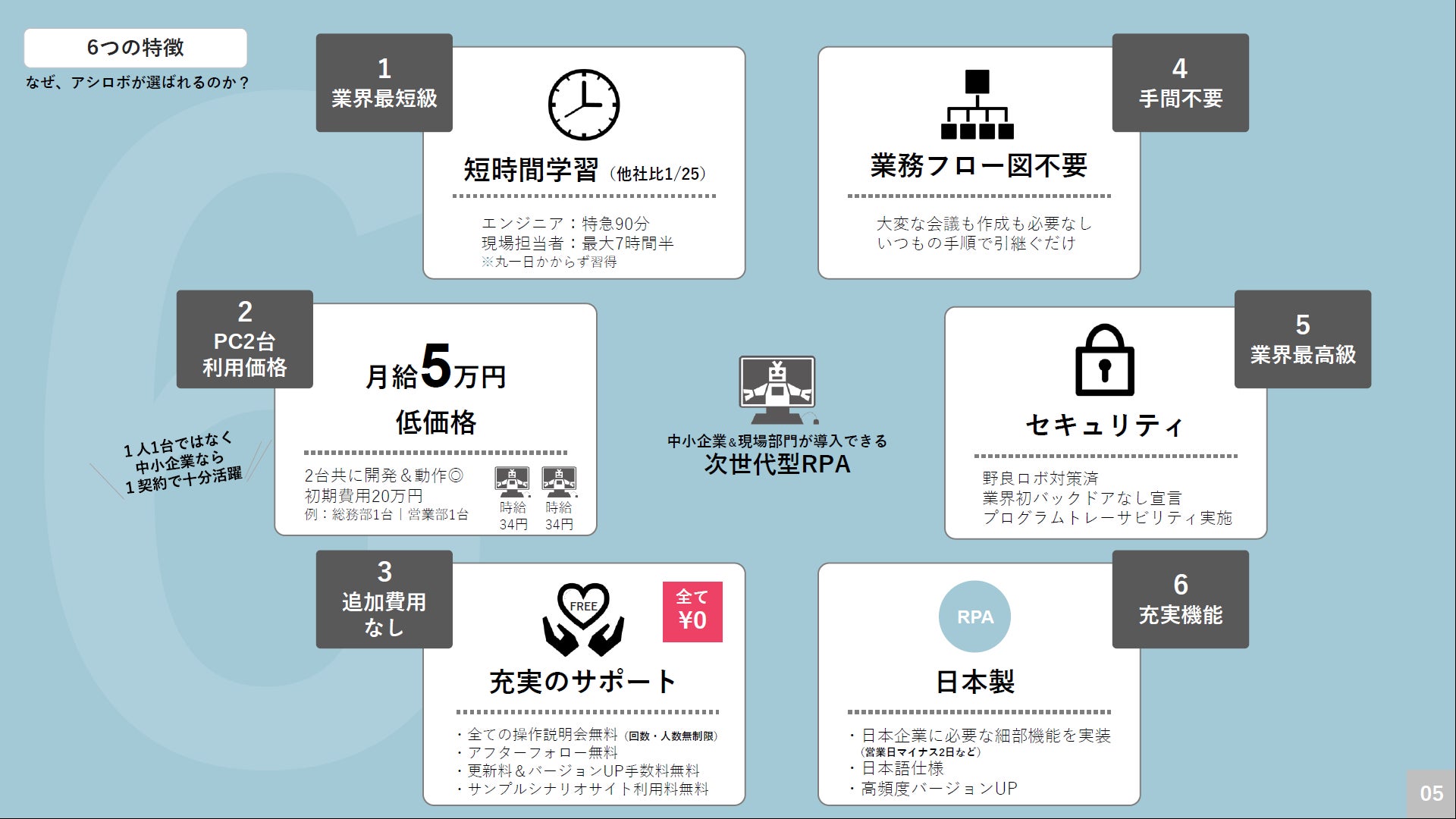 中小企業~大企業の部署単位向けの「低価格×簡単操作」を実現したRPAソフトです。業務フロー図や大規模な事前準備が不要で、OJT形式の教育同様に、ルールと手順を入力するだけのシンプルな構造が特長です。一般的に習得が難しいとされるRPA製品が多い中、最短90分から450分で習得可能な業界トップクラスの操作性を実現しました。防衛省をはじめ官公庁、自治体、大企業から町工場まで、1,200社以上に導入されています。