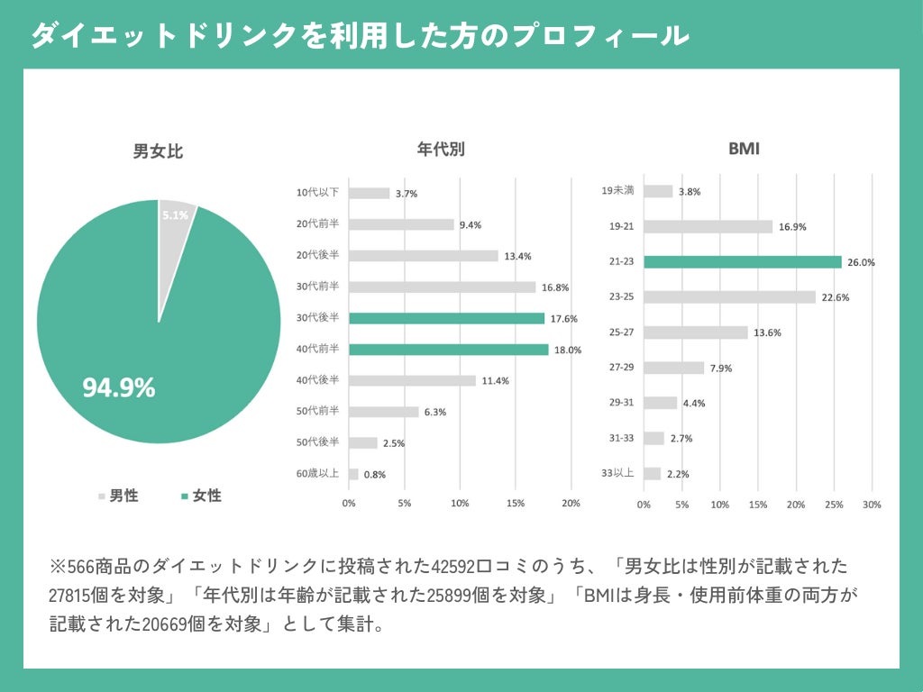 ダイエット効果を期待してダイエットドリンクを利用する方々のプロフィールについて、566種類のダイエットドリンクに寄せられた42592件の口コミを分析しました。その結果、利用者の94.9%が女性であり、年齢層は30代後半から40代前半が特に多くなっていました。さらに、肥満度指数(BMI)に関しては、健康的な標準体重(22)付近である「21-23」の範囲の方が26.0%と最も多いことが分かりました。
