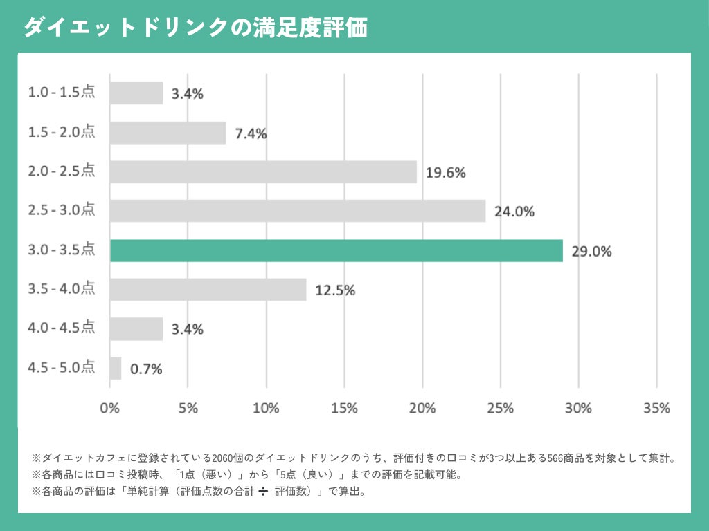 ダイエット効果が期待される566種類のダイエットドリンクに寄せられた42592件の口コミを分析したところ、「3.0-3.5点(少し良い)」という評価を受けている商品が29.0%(164商品)と最も多くなっていることが判明しました。