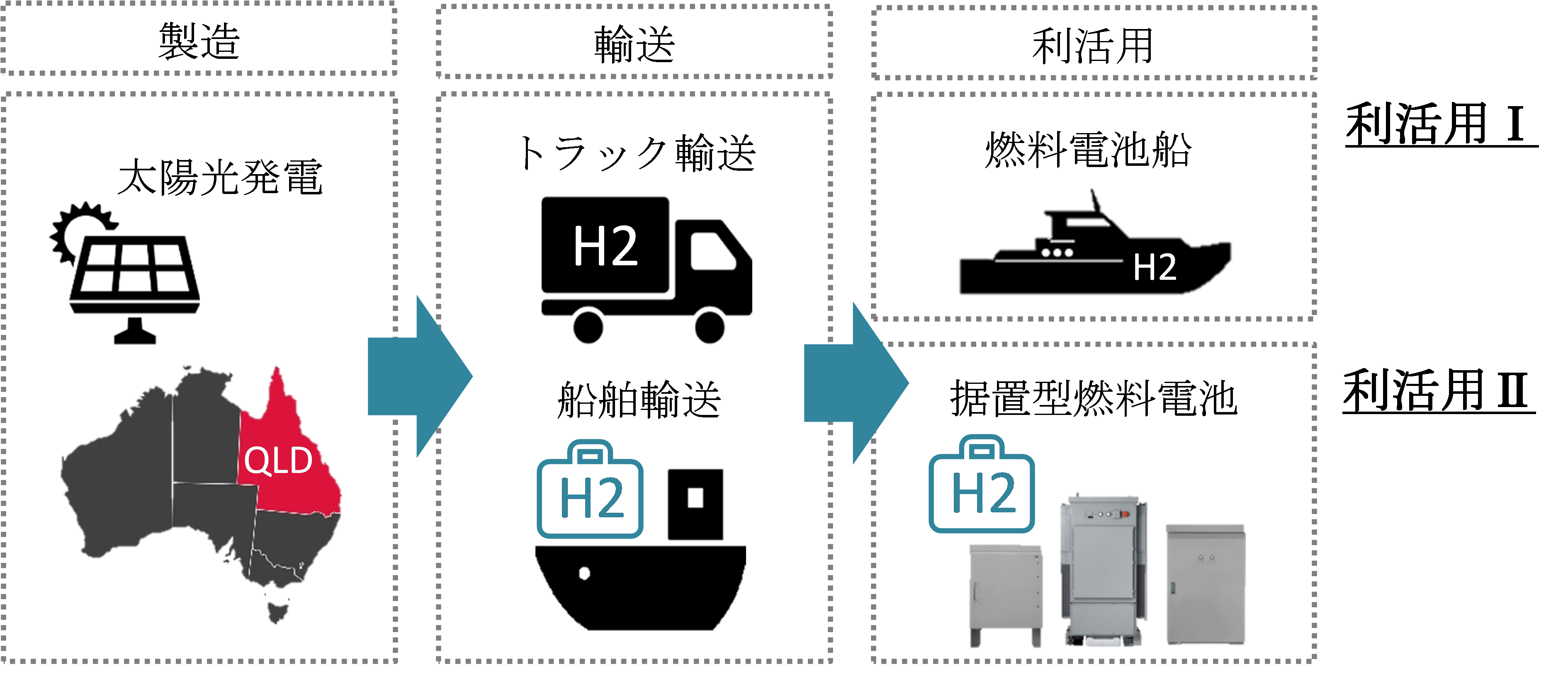 実証事業の内容は、豪州クイーンズランド州において太陽光発電電力によりグリーン水素を製造し、島嶼国での水素普及の足がかりと成り得る小型燃料電池、小型船舶への適用に関する実証を行うものです。双日が、実証事業の代表事業者としてプロジェクト全体の総括やパラオでの現地調査、設備導入サポートを担い、共同事業者としてCS Energyがグリーン水素の製造と供給を行い、大日本コンサルタントは島嶼国におけるエネルギー需給状況を踏まえ、水素の用途・需要見通しの調査、グリーン水素の海上輸送による経済性やCO2削減効果等の分析を行います。また、ブラザー工業株式会社が協力事業者として本事業に参加して燃料電池の実証を行います。