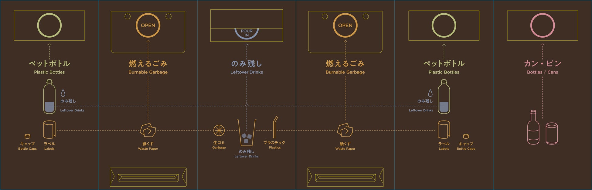全国清涼飲料連合会と連携し、BIPROGYが研究を進めているナッジ(注1)や仕掛学(注2)、インフォグラフィックス(注3)を活用したデザインで、「SmaGO」をラッピングしています。カテゴリーごとの色分けや、矢印を辿るゲーム性、注目を集めやすい丸い形状などで、ついごみや飲料容器を分別したくなるよう行動変容を促し、ごみの分別や飲料容器のリサイクルを促進します。ペットボトルについては、3分別や飲み残しの適切な処理を促すデザインを追記することで、リサイクルの取組を促進します。また、景観と調和したシンプルでスマートなデザインを採用しています。