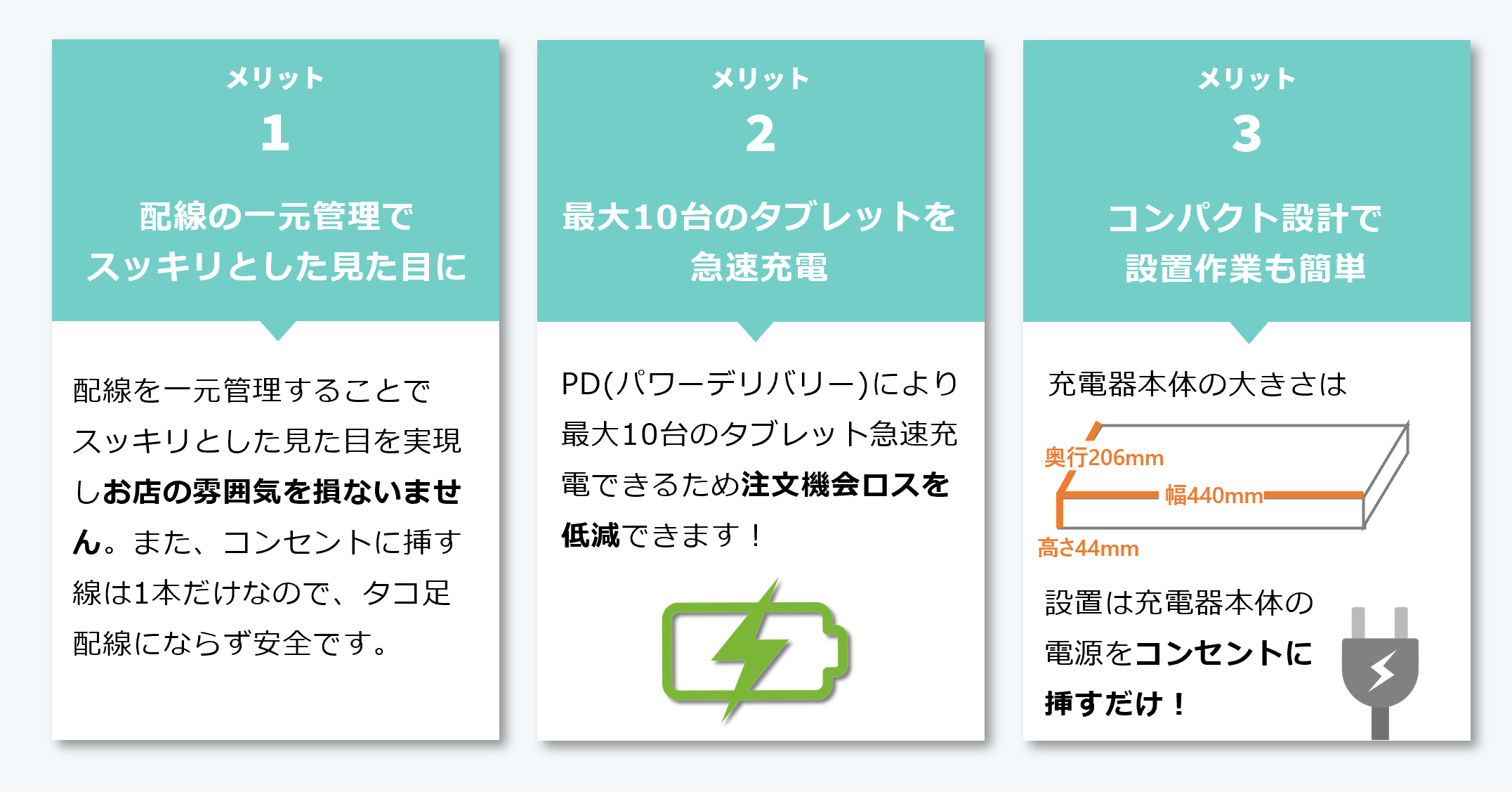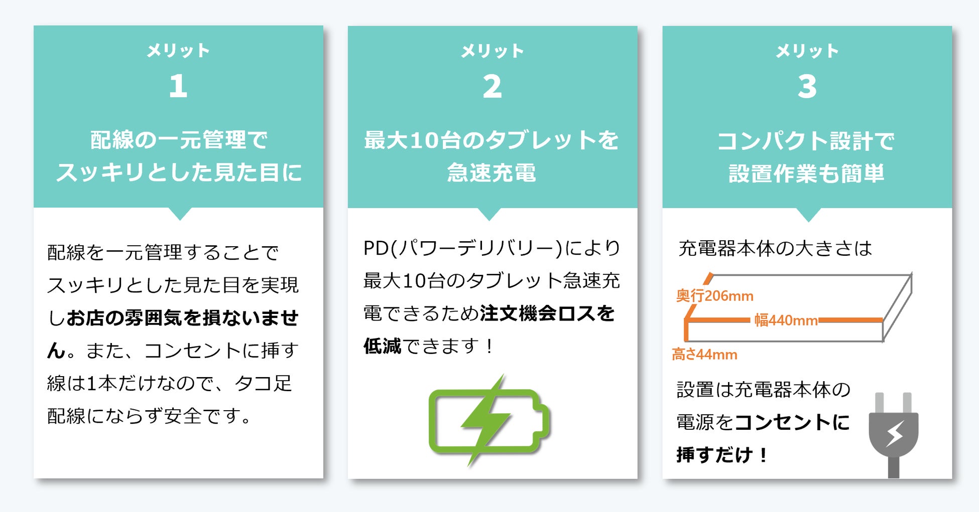 当社のUSB-C充電ユニットとタブレット用ラックは、最大10台のタブレットをスマートに充電でき、PD(パワーデリバリー)による急速充電によって注文機会ロスを低減することができます。また、信頼性の高い構造を採用しており、放熱対策も万全なため長期間ご使用いただけます。さらに、コンパクトな設計のため設置スペースを取らず、設置作業も簡単です。配線は一元化することでスッキリとした見た目を実現し、お店の雰囲気を損なうことなく、お客様に快適な利用環境を提供することができます。