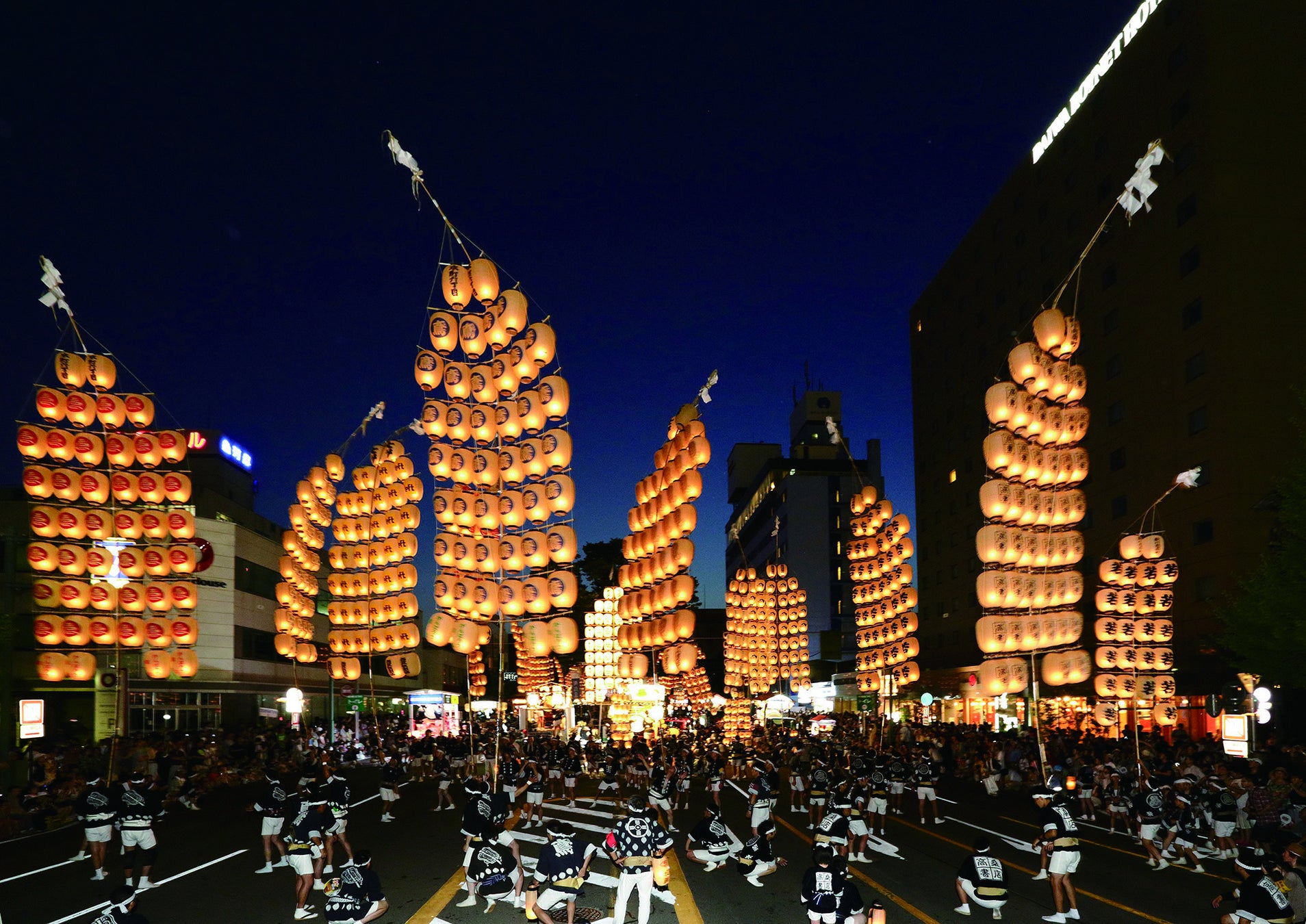 秋田市は、城下町としての歴史と、周辺に広がる稲作地帯を背景に発展してきた北東北の中核都市です。その農耕文化と民間信仰から生まれたのが、秋田竿燈まつりです。江戸時代の「ねぶり流し」を起源とし、眠気や邪気を払い、五穀豊穣と無病息災を祈る行事として受け継がれてきました。稲穂にも重なるシルエットの提灯を掲げ、町内ごとに技を競う竿燈は、農の営みと地域共同体の結束を象徴する存在であり、秋田の風土と暮らしが生んだ灯りの祭礼です。