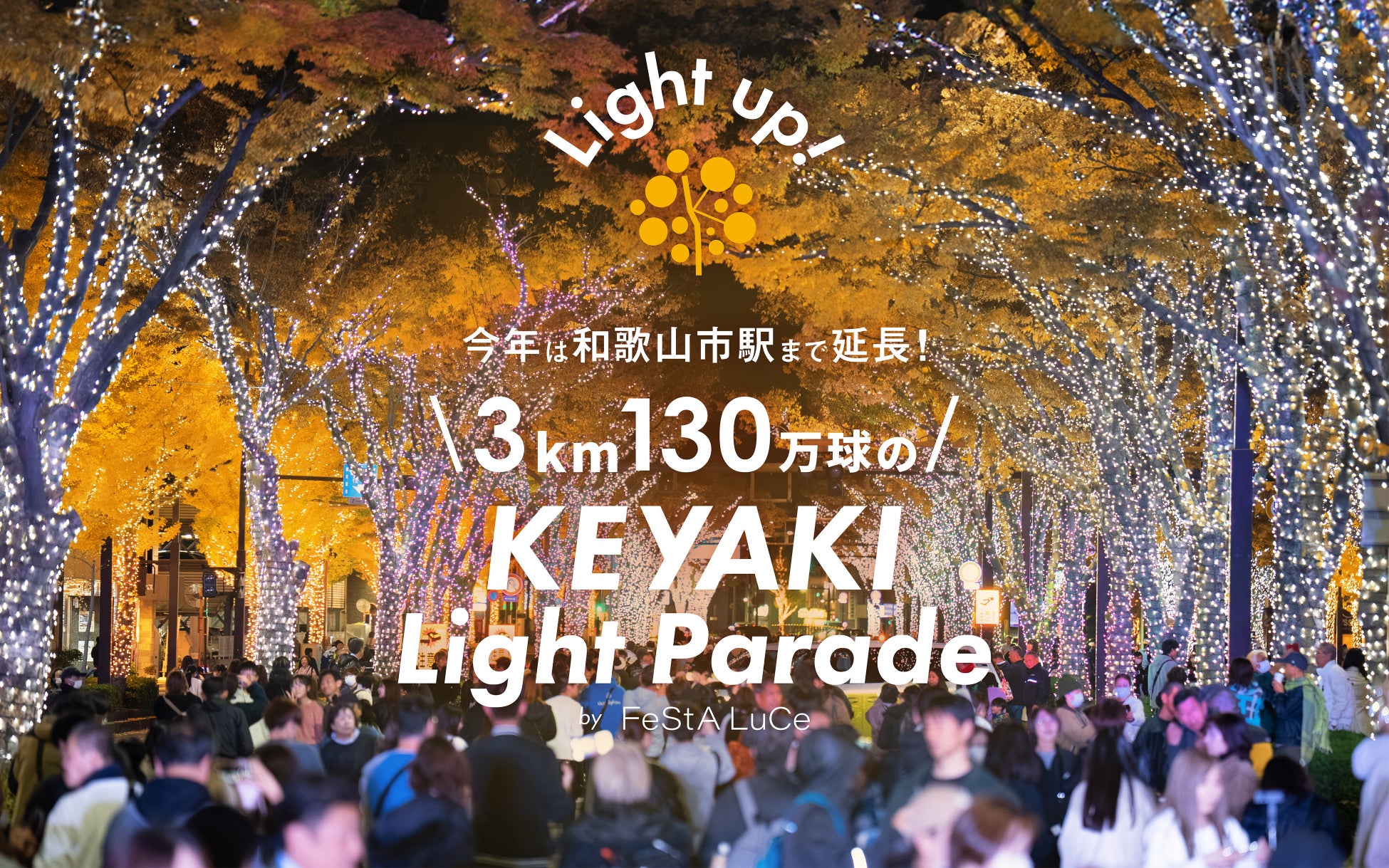 2025年のけやきライトパレードは、昨年のイルミネーション100万球からさらにスケールアップし、130万球の光がけやき大通りを彩ります。点灯する樹木の本数も435本となり、イルミネーションの美しさと迫力が一段と高まりました。今年は点灯エリアを拡大し、JR和歌山駅から和歌山城、そして南海和歌山市駅までの3kmにわたる通りが光に包まれます。歩道には人々の笑顔があふれ、まるでみんながパレードの主役のように、光の中を歩く風景が生まれています。