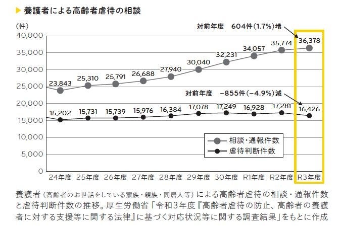 また、厚生労働省の「令和3年度『高齢者虐待の防止、高齢者の養護者に対する支援等に関する法律』に基づく対応状況等に関する調査結果」によると、養護者(高齢者のお世話をしている家族・親族・同居人等)による高齢者虐待の相談・通報件数は年々増加しており、2021年には3万6378件となっています。