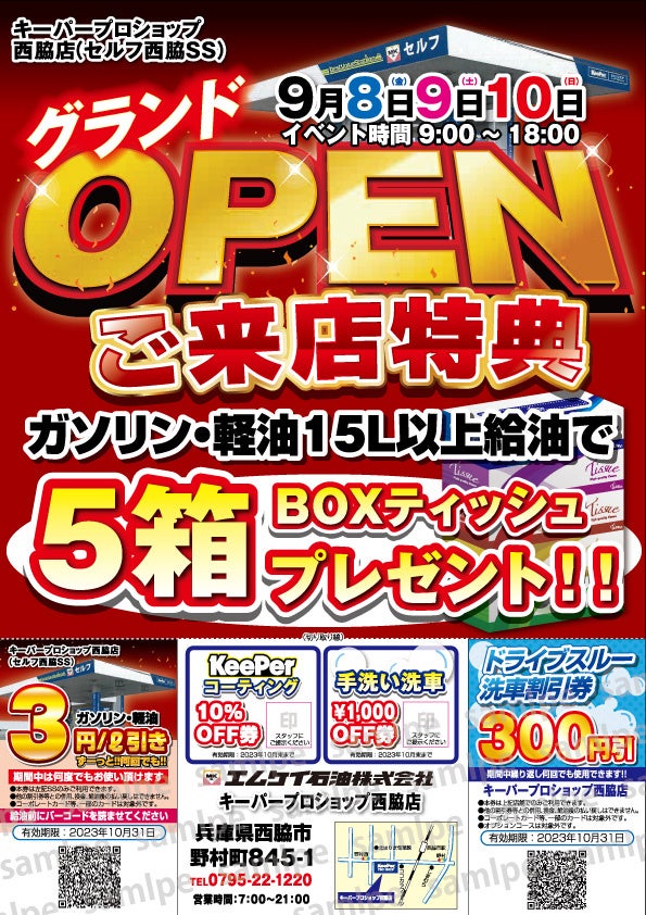 またイベント期間の9月8日~10日の3日間、9時から18時に来店しガソリン・軽油15リットル以上給油された方にはBOXティッシュ5箱をプレゼント。
