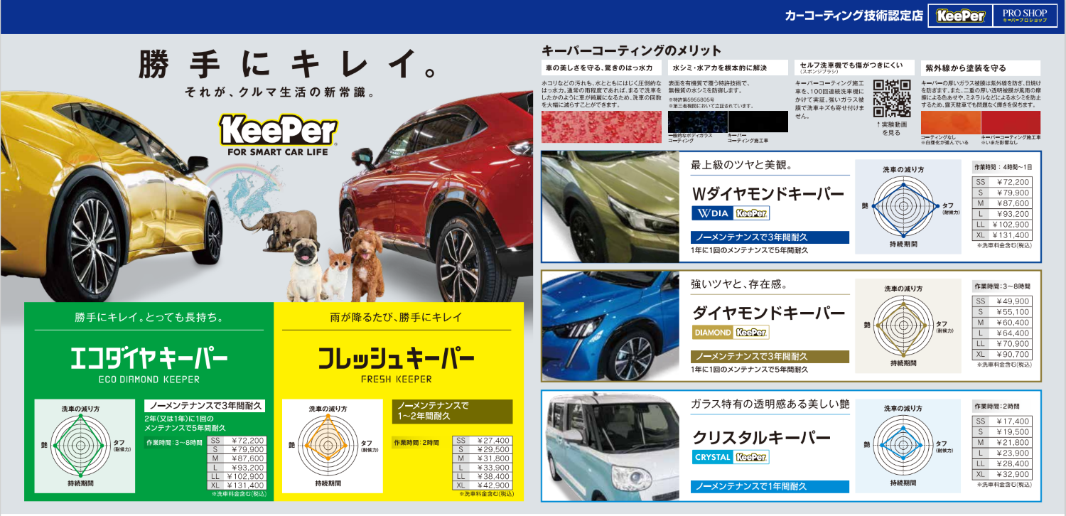 キーパーコーティングは驚きの撥水力で車の美しさを守り、洗車回数を大幅に減らすことができます。水シミ・水アカを防御しセルフ洗車機でも傷がつきにくく紫外線から塗装を守ります。キーパープロショップ西脇店がお勧めするキーパーコーティングのコースがフレッシュキーパー。ノーメンテナンスで耐久期間は1~2年。「雨が降るたび、勝手にキレイ」を体験してください。ほかにもコースは多数あります。