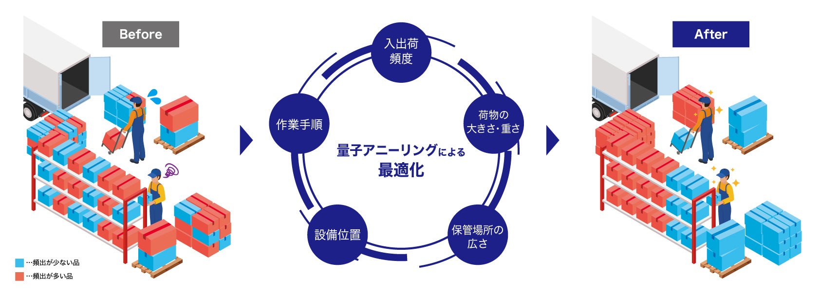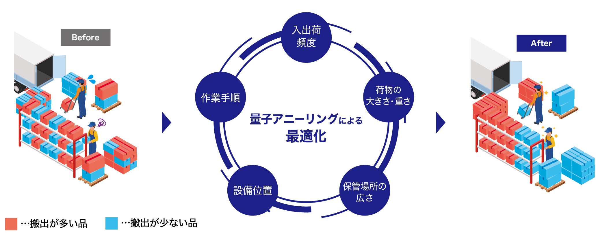 本実証実験では、高速の物流倉庫内での、入庫、ピッキング、出庫などの一連の作業が効率的に実施可能となる最適な商品配置の実現を、量子アニーリングを活用した最適化技術により目指します。