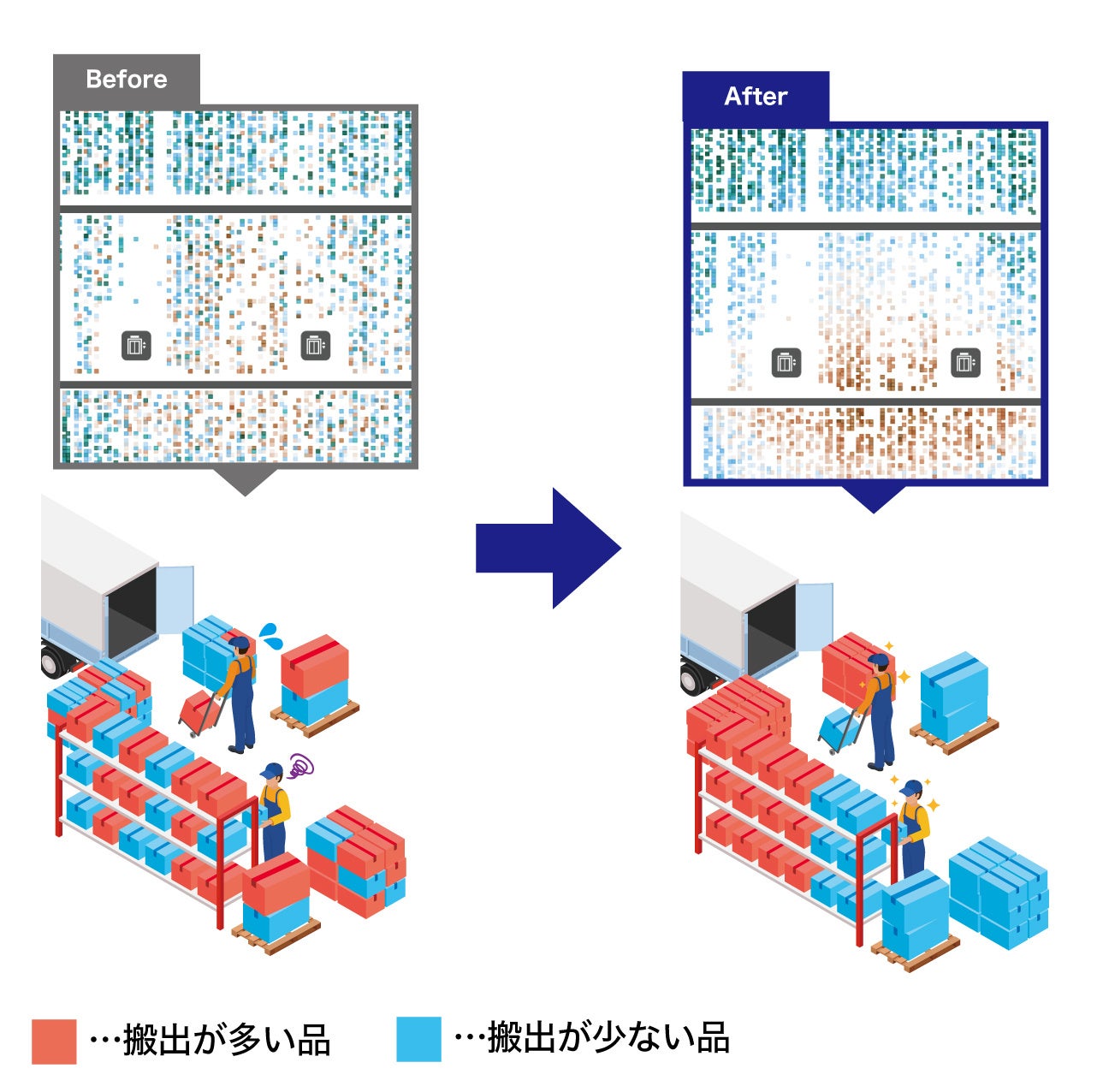物流倉庫内の商品の保管場所を最適化することで、入出庫業務の負担軽減、作業時間の縮減やそれに伴うオペレーションの効率化の実現を目指す