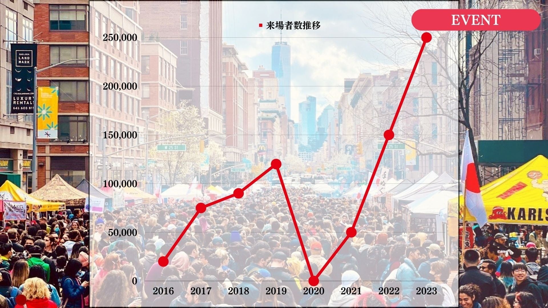 2016年にスタートしたJAPAN Fes New York(ジャパンフェス)は、年間開催数20回、年間来場者数25万人、年間出店者数700店舗(うち日本から50店舗)の世界最大の食フェスです。日本の食、日本の伝統工芸品、日本のアートからエンターテイメントまで、日本文化を地元ニューヨーカーに楽しんでもらいたいという想いでこれまで開催してきました。