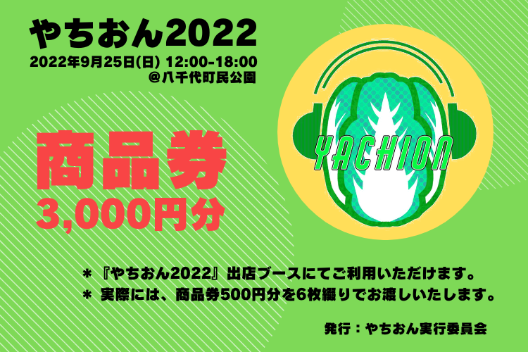 ・返礼品:「やちおん2022」出店ブースにてご利用いただける商品券 3,000円分