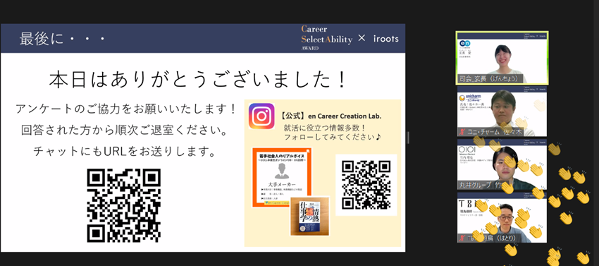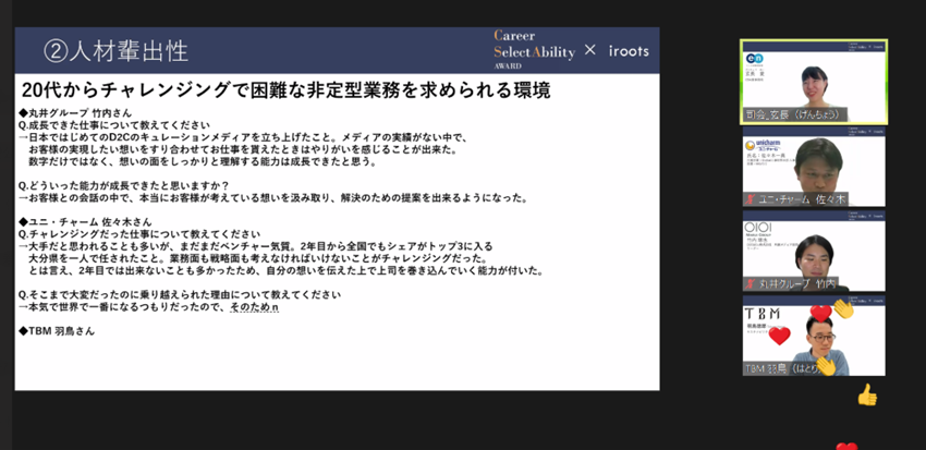 計1時間30分のイベントでしたが、100名以上に参加いただき、最後の質疑応答まで盛り上がりました。登壇者の皆様の熱いお話に学生のみなさんからもたくさんリアクションをいただきました。