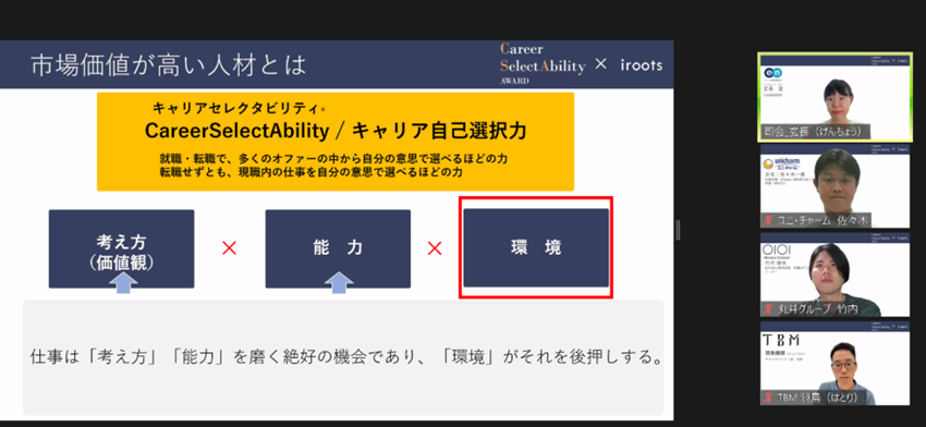 イベントの中では、市場価値が高い人材とはどういうことなのか、という説明から、市場価値が高い人材になるために選ぶべき企業選びのポイントをお伝えし、ポイントに沿って各企業の登壇者のリアルな仕事のお話を聞いていきました。