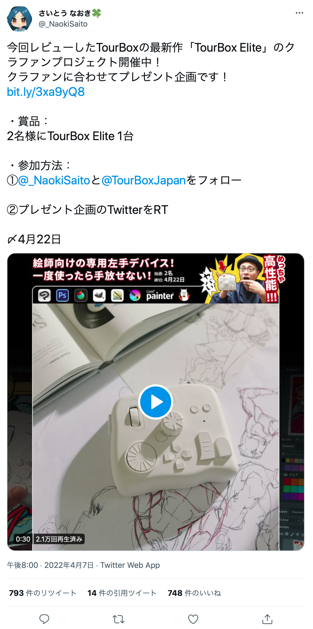 現在クラファンでプロジェクトを実施中のPC・Mac用クリエイティブコントローラー(通称・左手デバイス)の新型『TourBox Elite』。支援総額1.1億円を突破したことを記念して、ポケモンカード公認イラストレーターとして有名な、さいとうなおき氏とのコラボレーションで、『TourBox Elite』が当たるプレゼント企画をTwitterで開催中。