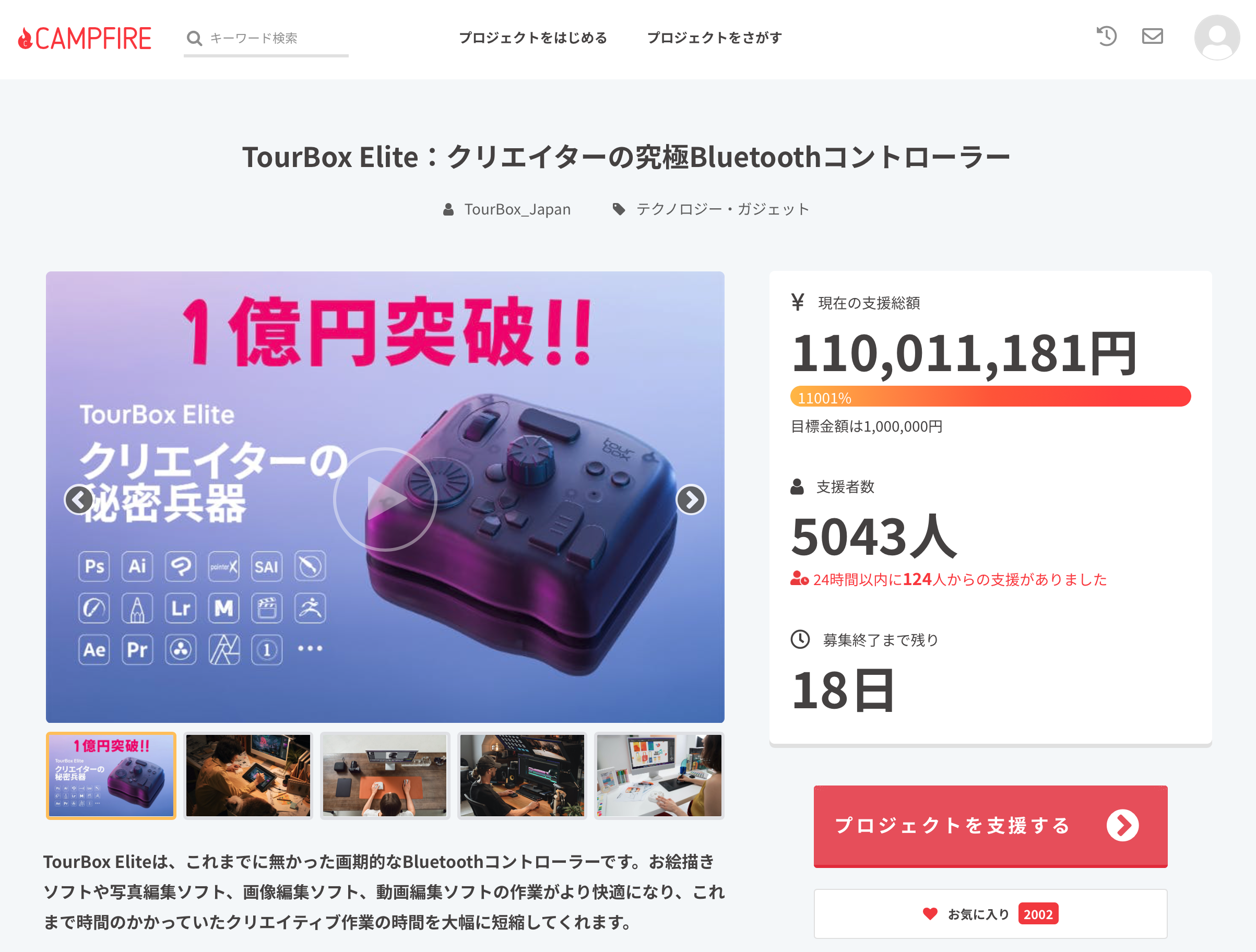 2021年11月、アメリカのクラウドファンディングにおいて『TourBox Elite』のプロジェクトを実施。支援額は約$710,000(約8,157万円)、バッカー(支援者)は2827人を達成しました。『TourBox』シリーズのクラウドファンディングにおいて最高記録を出しました。