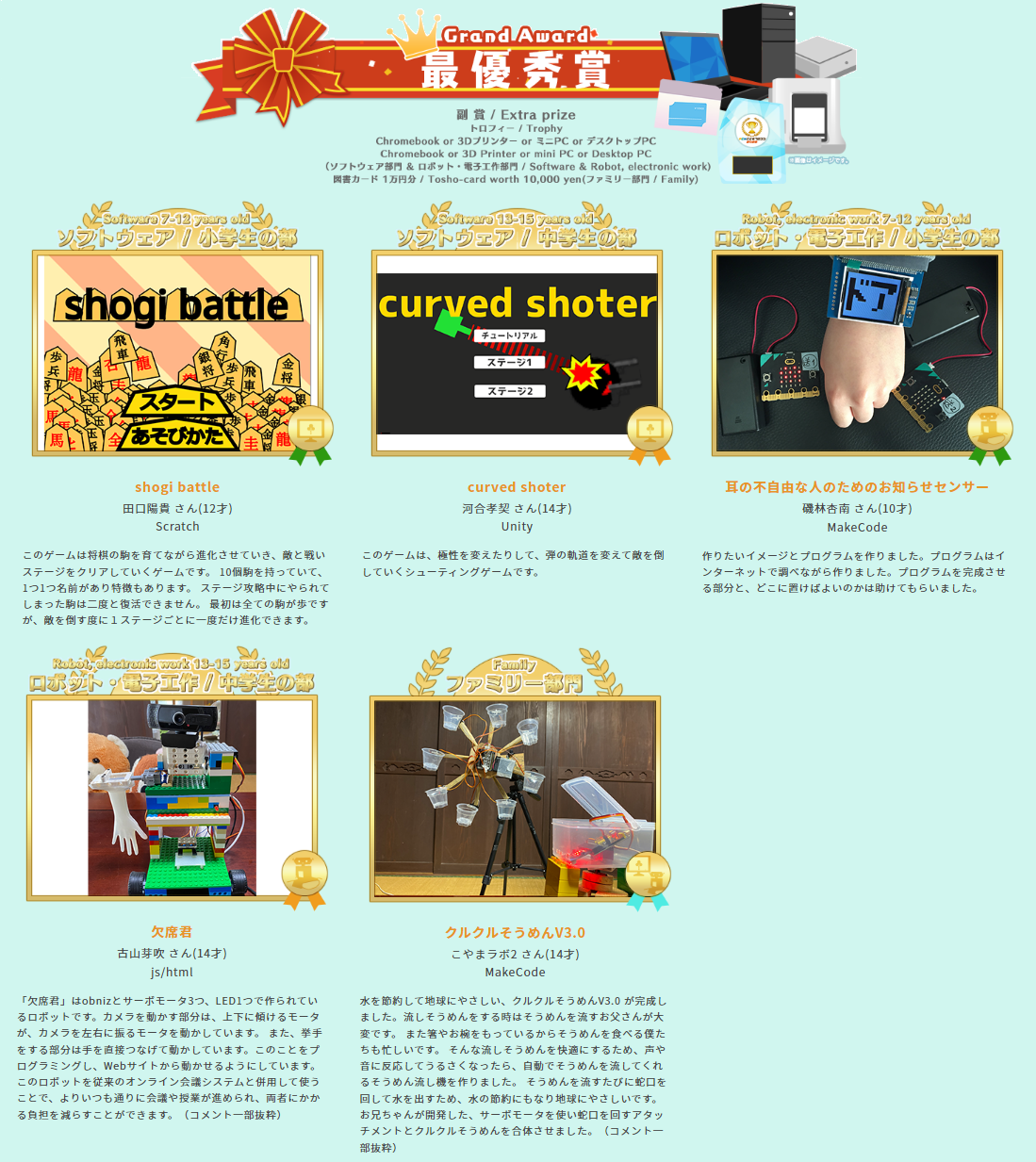 賞 :ソフトウェア部門/ロボット・電子工作部門/ファミリー部門の5部門毎に、最優秀賞1作品。その他優秀賞と審査員賞。