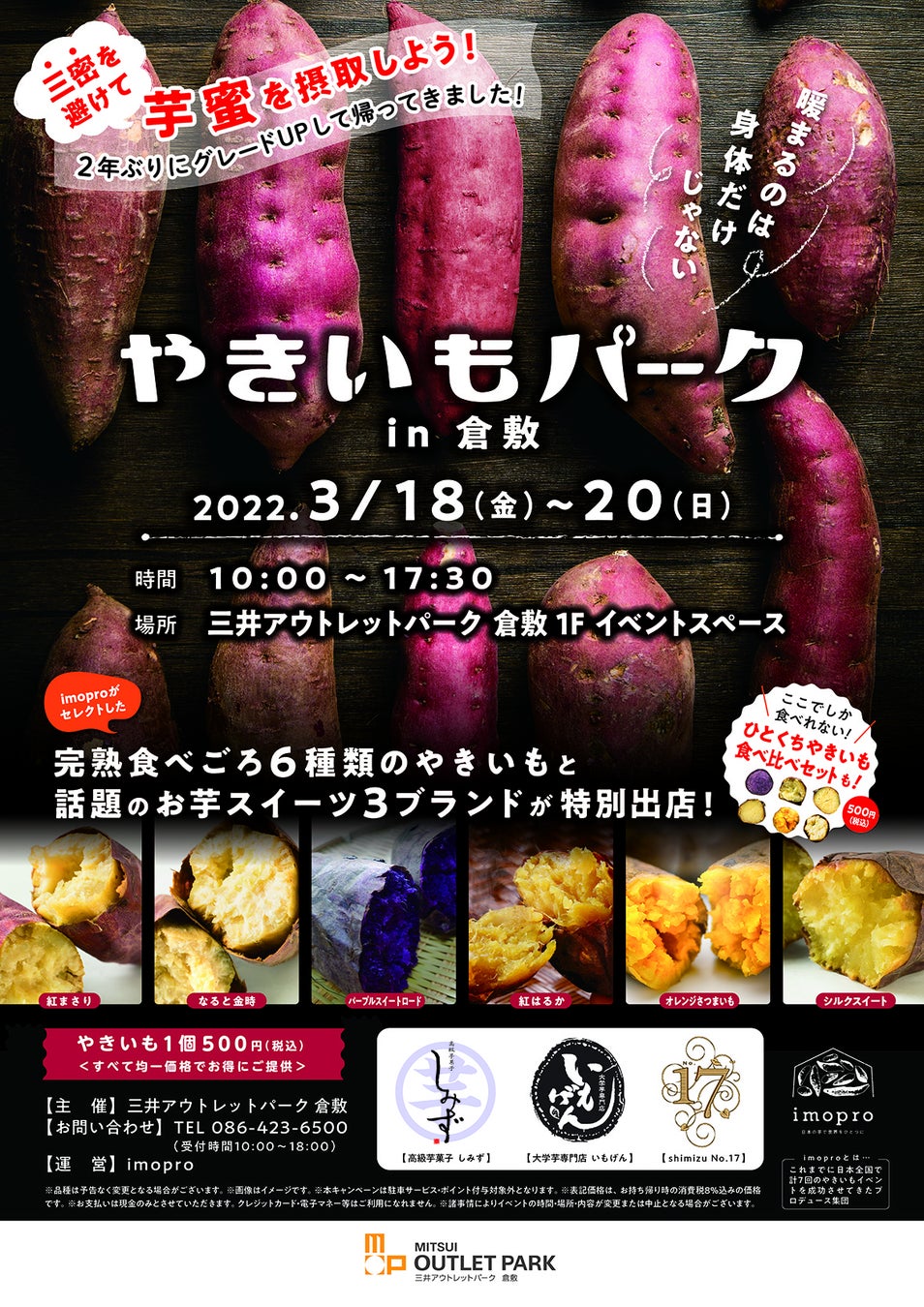 やきいもパークオフィシャルブースにて「やきいも単品」または「6種食べ比べセット」をお買上げ時、当日、館内で5,000円(税込・合算可)以上お買上げのレシートをご提示で、三井アウトレットパーク 倉敷オリジナルトートバッグをプレゼントいたします。