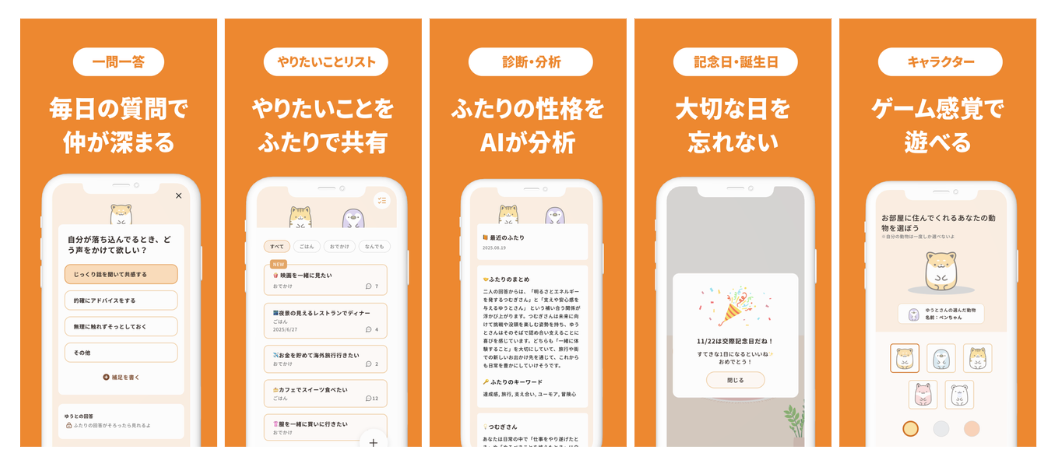 近年、恋人・夫婦・パートナー間の関係性をテクノロジーで支援する「カップルTech」領域は、欧米・アジアを中心に市場規模が拡大しています。当社は「誰もが大切な人とずっと幸せでいる社会をつくる」ことをミッションに、AIを活用したカップル向けコミュニケーションアプリを提供、高い継続率とユーザー評価を獲得しております。